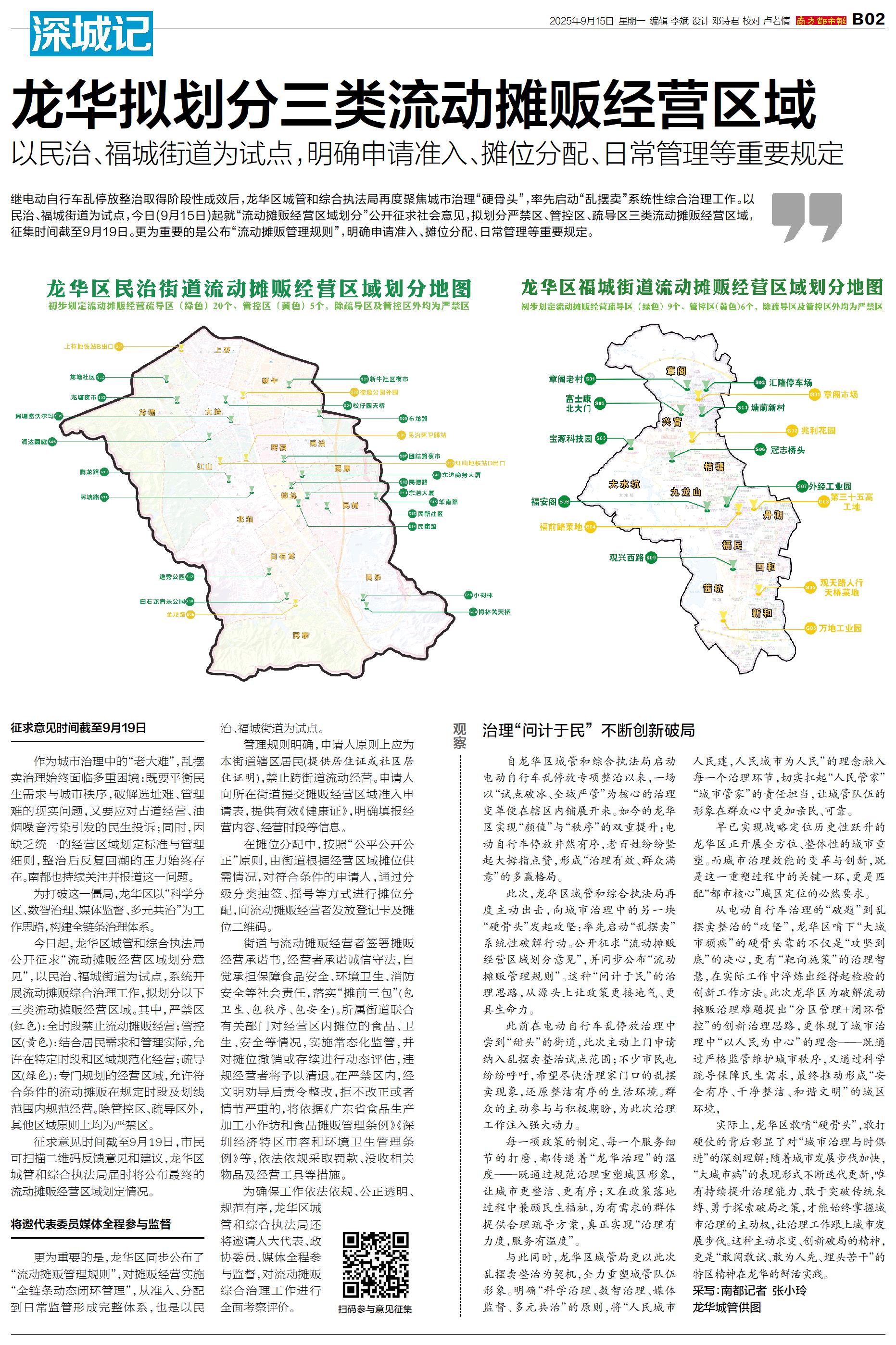 继电动自行车乱停放整治取得阶段性成效后,龙华区城管和综合执法局再度聚焦城市治理“硬骨头”,率先启动“乱摆卖”系统性综合治理工作。以民治、福城街道为试点,今日(9月15日)起就“流动摊贩经营区域划分