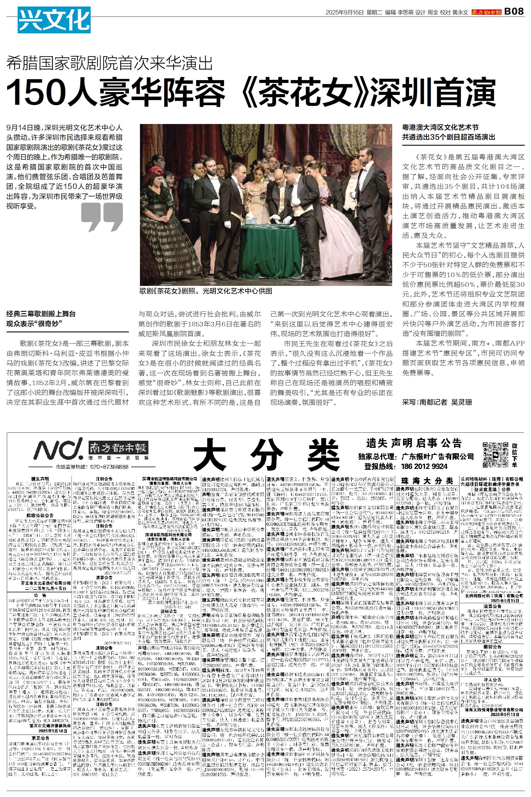 9月14日晚,深圳光明文化艺术中心人头攒动。许多深圳市民选择来观看希腊国家歌剧院演出的歌剧《茶花女》度过这个周日的晚上。作为希腊唯一的歌剧院,这是希腊国家歌剧院的首次中国巡演。他们携管弦乐团、合唱
