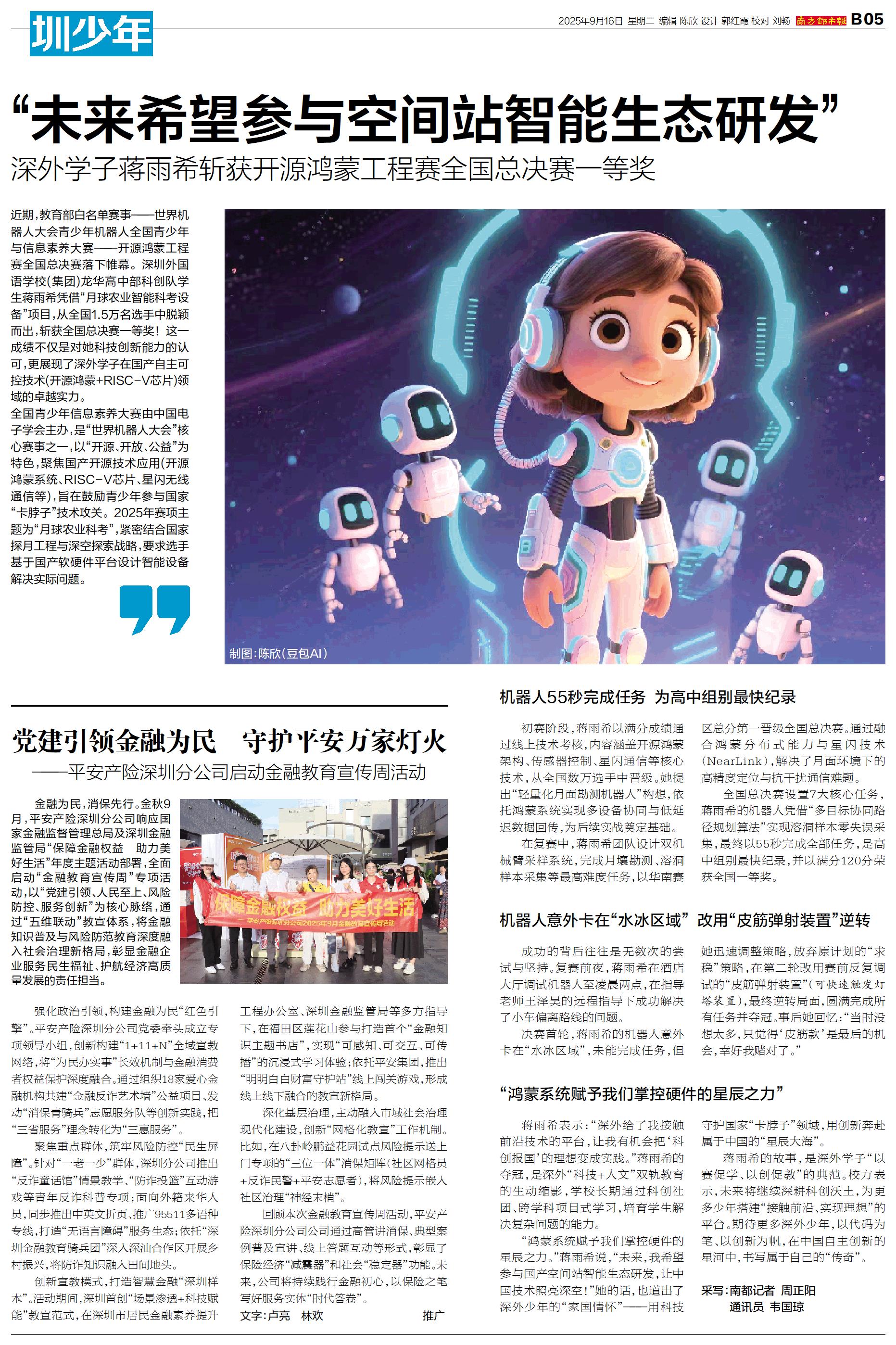 近期,教育部白名单赛事——世界机器人大会青少年机器人全国青少年与信息素养大赛——开源鸿蒙工程赛全国总决赛落下帷幕。深圳外国语学校(集团)龙华高中部科创队学生蒋雨希凭借“月球农业智能科考设备”项目,