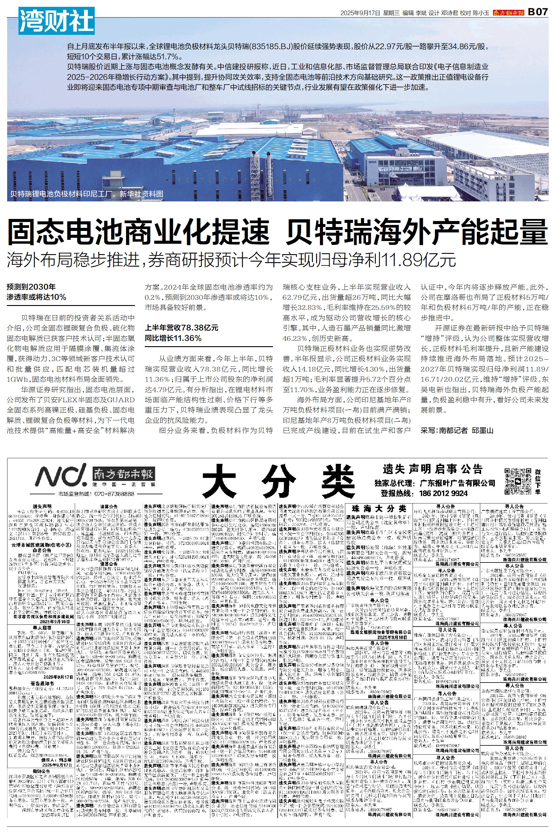 自上月底发布半年报以来,全球锂电池负极材料龙头贝特瑞(835185.BJ)股价延续强势表现,股价从22.97元/股一路攀升至34.86元/股,短短10个交易日,累计涨幅达51.7%。 贝特瑞股价