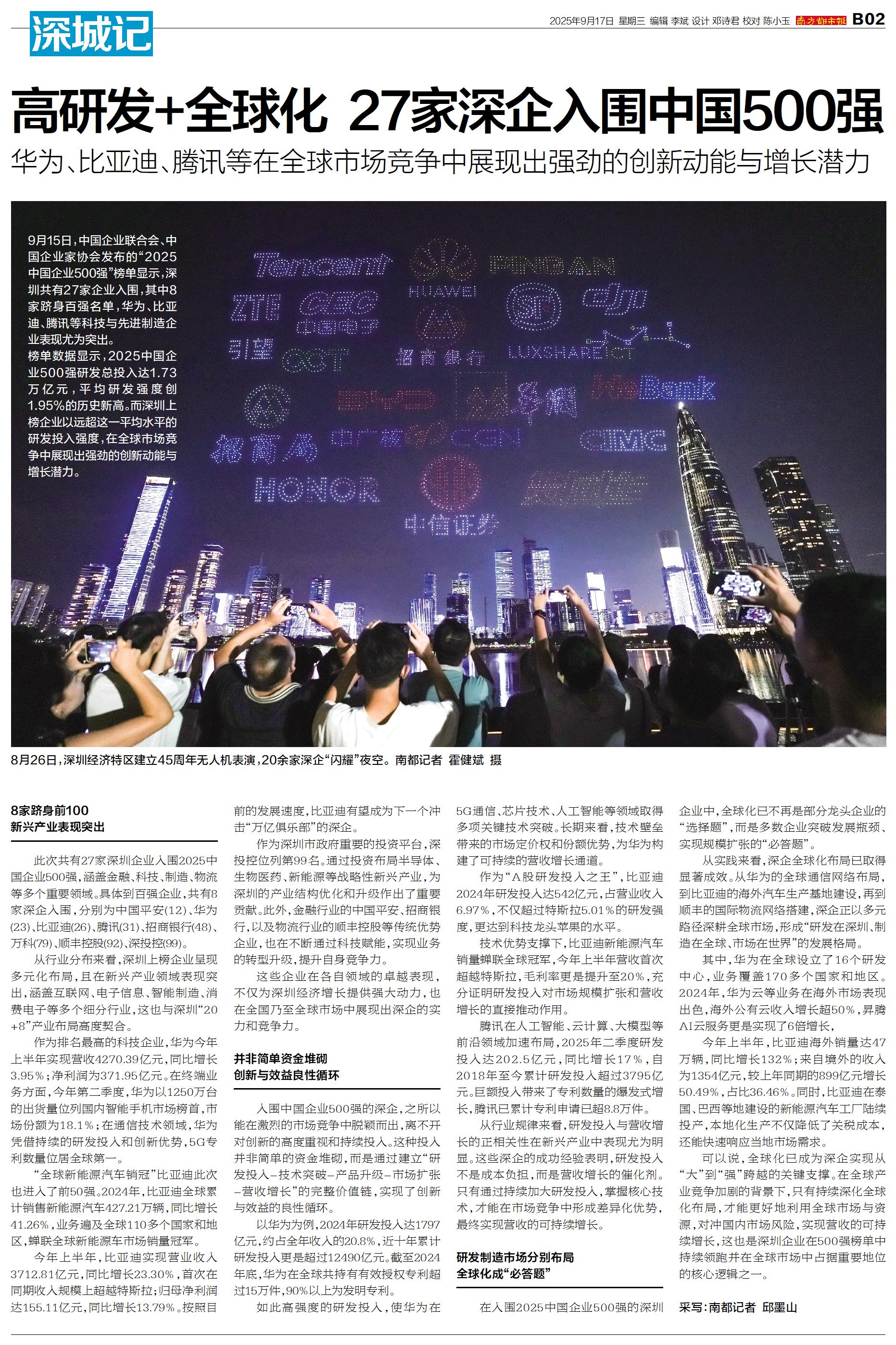 9月15日,中国企业联合会、中国企业家协会发布的“2025中国企业500强”榜单显示,深圳共有27家企业入围,其中8家跻身百强名单,华为、比亚迪、腾讯等科技与先进制造企业表现尤为突出。 榜单数据