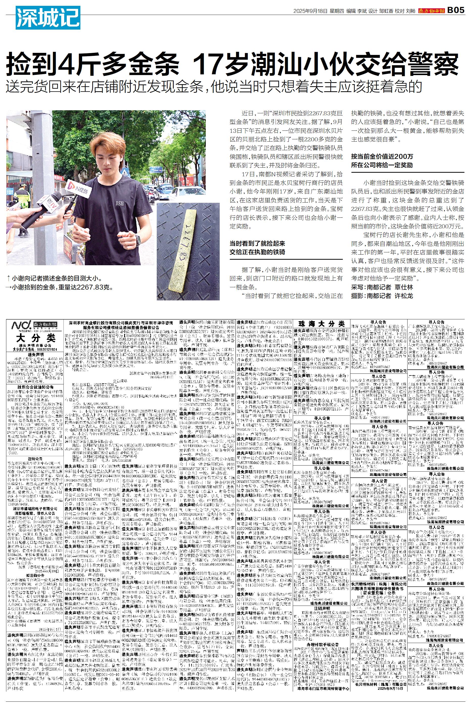 捡到4斤多金条 17岁潮汕小伙交给警察