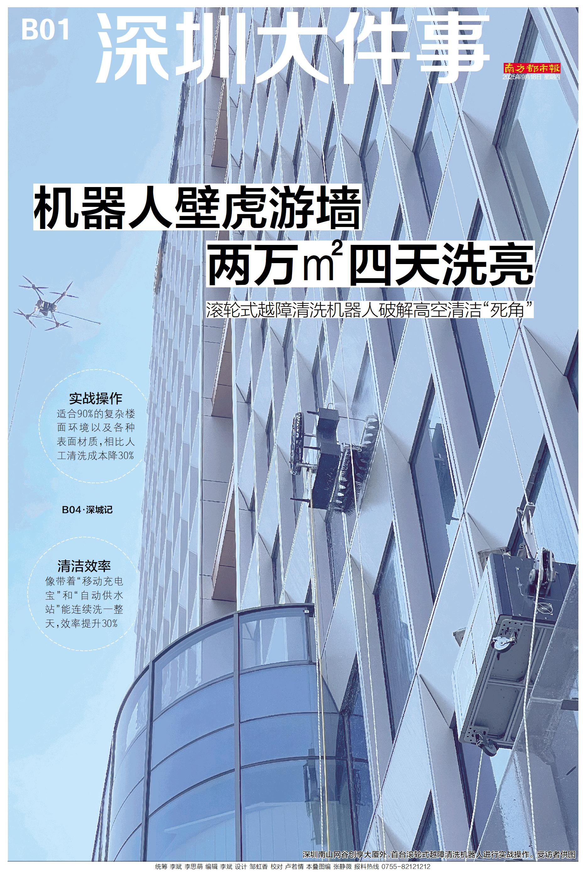实战操作 适合90%的复杂楼面环境以及各种表面材质,相比人工清洗成本降30% 清洁效率 像带着“移动充电宝”和“自动供水站”能连续洗一整天,效率提升30% B04·深城记