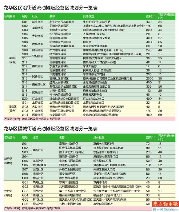 龙华区城管和综合执法局对各界意见深入研究、充分吸纳,对方案进行优化调整,最终形成科学合理的划分结果。其中,民治街道划定流动摊贩经营疏导区(绿色)20个、管控区(黄色)4个,两类区域共计可容纳725个流动摊位经营。福城街道划定流动摊贩经营疏导区(绿色)9个、管控区(黄色)6个,两类区域共计可容纳326个流动摊位经营。除管控区、疏导区外,其余区域均为严禁区,全面禁止任何形式的流动摊贩经营活动。对文明劝导后拒不改正或者情节严重的,将依据《广东省食品生产加工小作坊和食品摊贩管理条例》《深圳经济特区市容和环境卫生管理条例》等,依法依规采取罚款、没收相关物品及经营工具等措施。