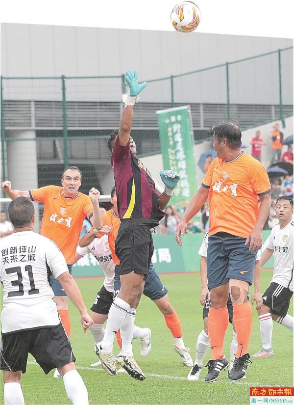 9月20日,街超揭幕表演赛上,深圳健力宝角球攻势被街超明星队守门员化解。 南都记者 赵炎雄 实习生 程佳丽 摄