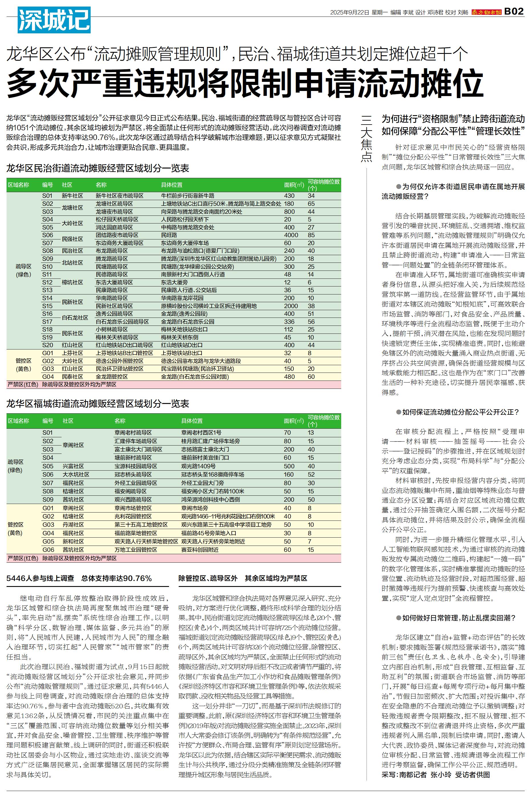 龙华区“流动摊贩经营区域划分”公开征求意见今日正式公布结果。民治、福城街道的经营疏导区与管控区合计可容纳1051个流动摊位,其余区域均被划为严禁区,将全面禁止任何形式的流动摊贩经营活动,此次问卷调