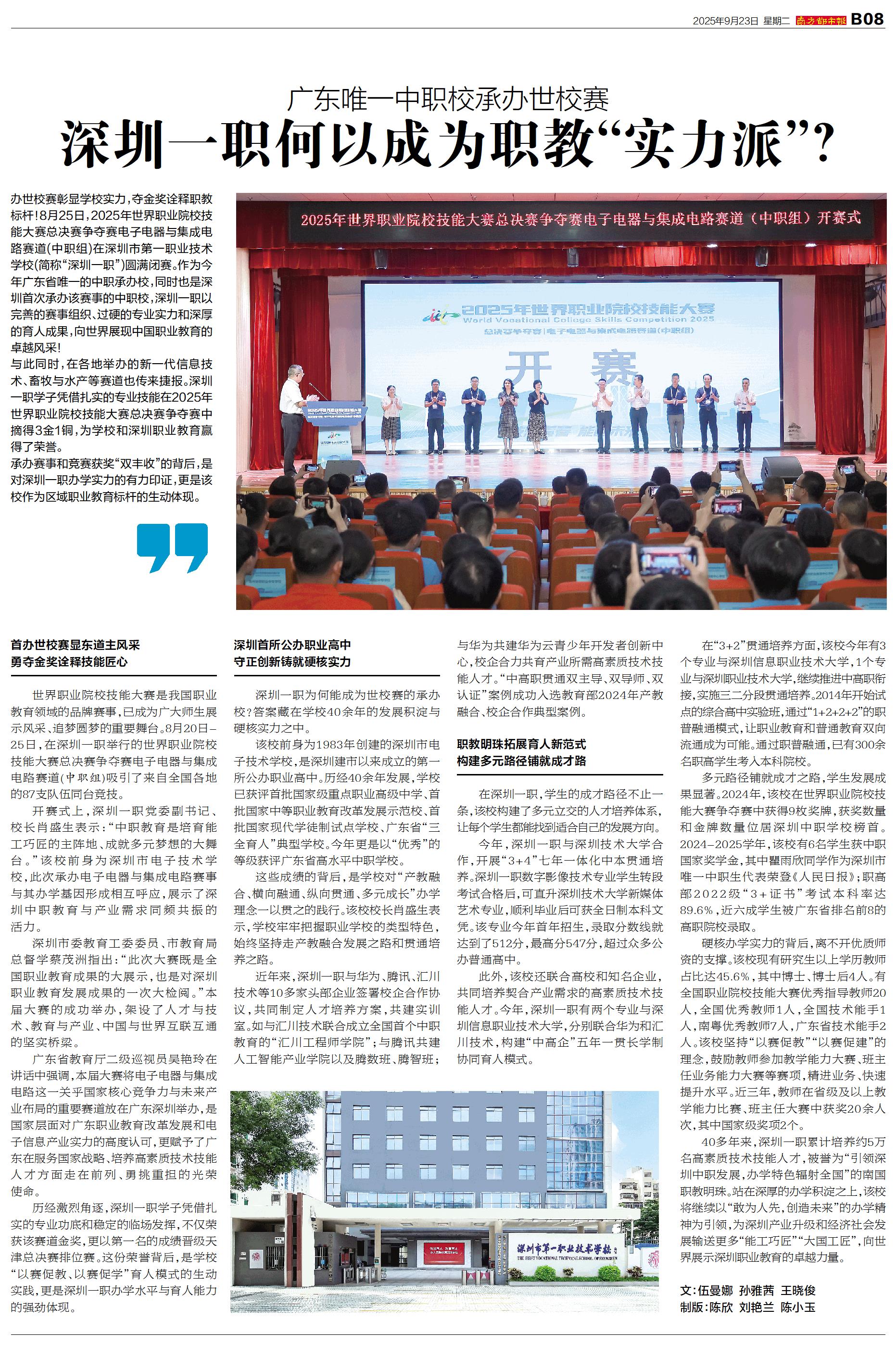 办世校赛彰显学校实力,夺金奖诠释职教标杆!8月25日,2025年世界职业院校技能大赛总决赛争夺赛电子电器与集成电路赛道(中职组)在深圳市第一职业技术学校(简称“深圳一职”)圆满闭赛。作为今年广东省唯一的中职承办校,同时也是深圳首次承办该赛事的中职校,深圳一职以完善的赛事组织、过硬的专业实力和深厚的育人成果,向世界展现中国职业教育的卓越风采!