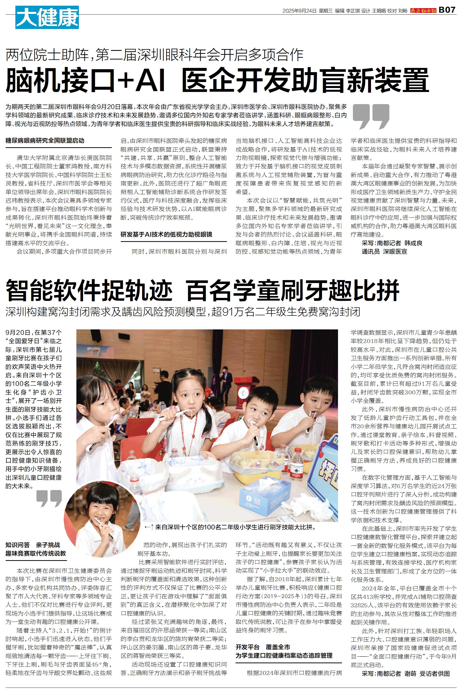 9月20日,在第37个“全国爱牙日”来临之际,深圳市第七届儿童刷牙比赛在孩子们的欢声笑语中火热开启。来自深圳十个区的100名二年级小学生化身“护齿小卫士”,展开了一场别开生面的刷牙技能大比拼。小选
