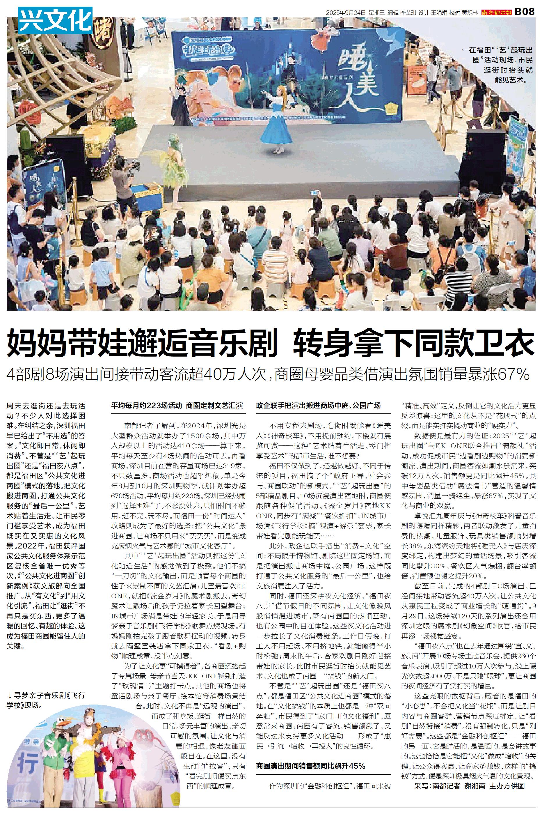 在福田“‘艺’起玩出圈”活动现场,市民逛街时抬头就能见艺术。 寻梦亲子音乐剧《飞行学校》现场。 周末去逛街还是去玩活动?不少人对此选择困难。在纠结