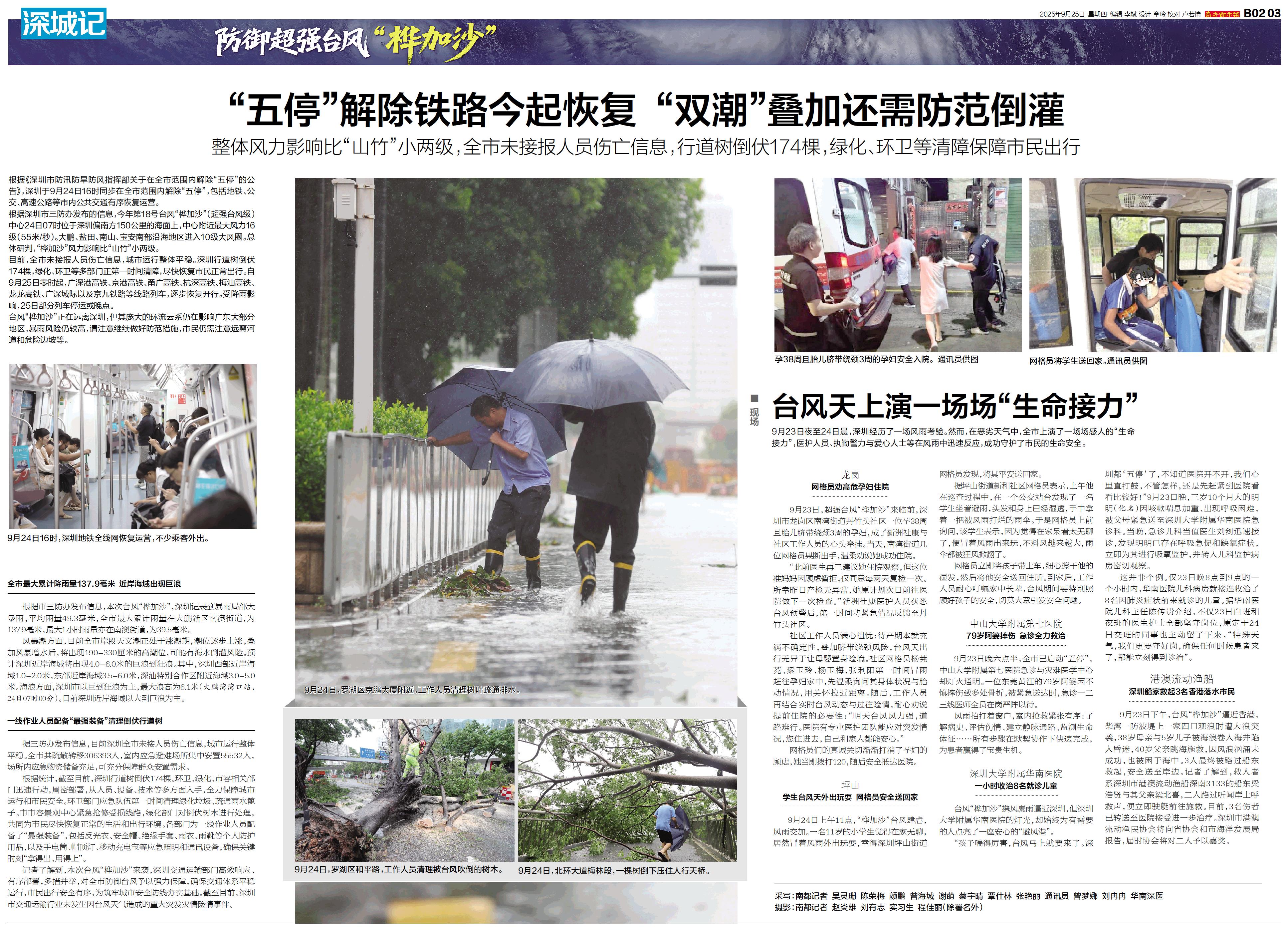 ■ 现场 9月23日夜至24日晨,深圳经历了一场风雨考验。然而,在恶劣天气中,全市上演了一场场感人的“生命接力”,医护人员、执勤警力与爱心人士等在风雨中迅速反应,成功守护了市民的生命安全。 龙