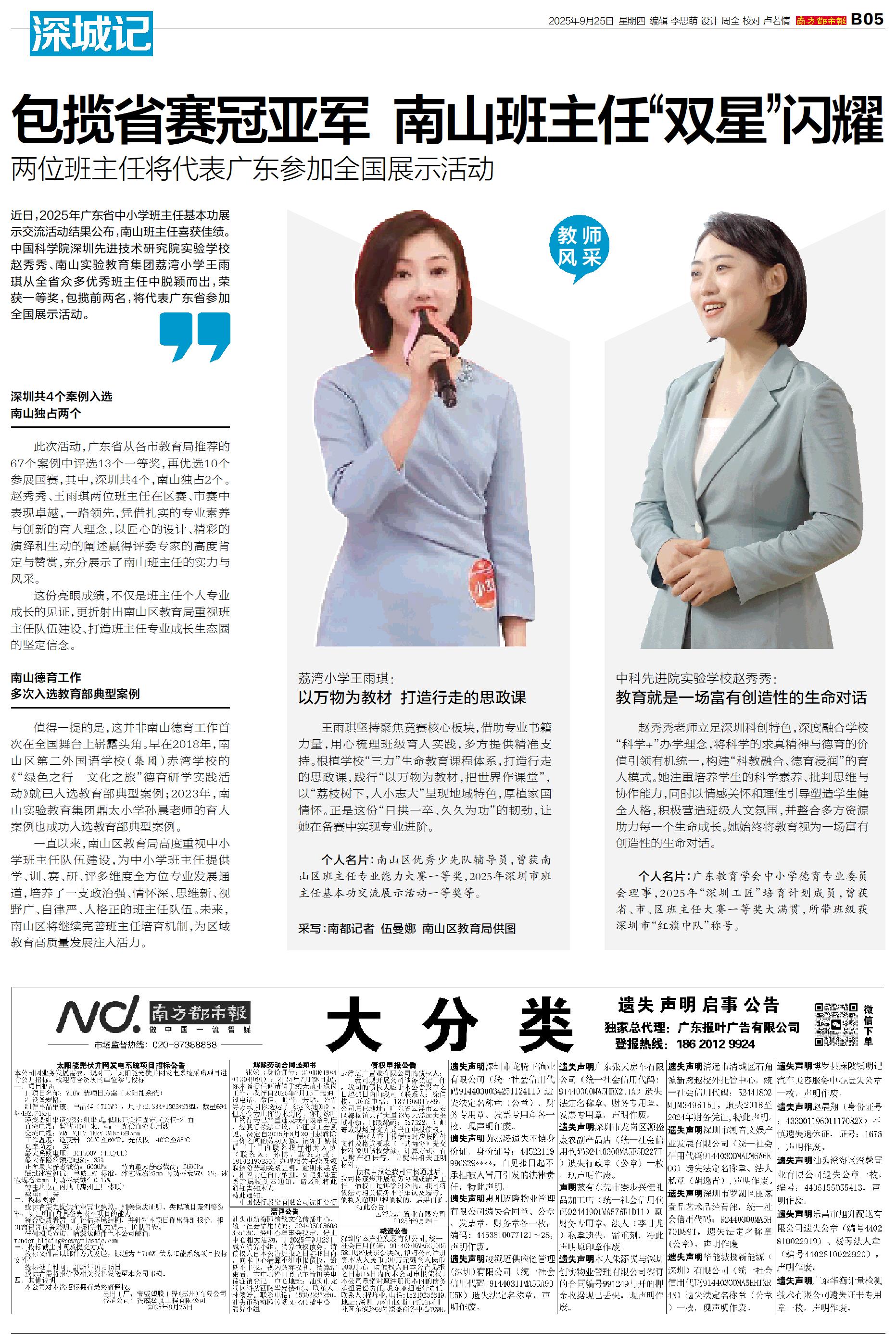 近日,2025年广东省中小学班主任基本功展示交流活动结果公布,南山班主任喜获佳绩。中国科学院深圳先进技术研究院实验学校赵秀秀、南山实验教育集团荔湾小学王雨琪从全省众多优秀班主任中脱颖而出,荣获一等