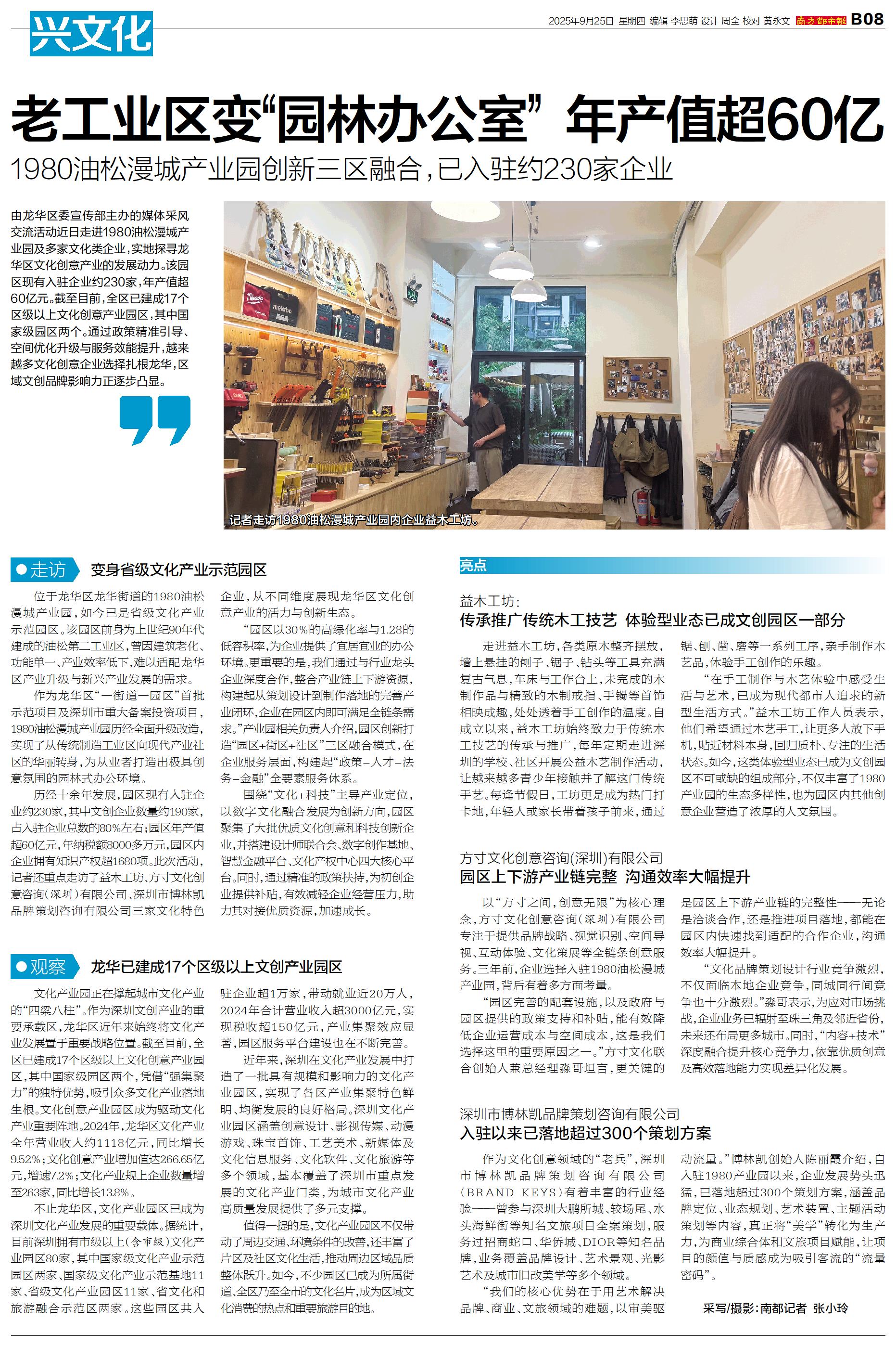 由龙华区委宣传部主办的媒体采风交流活动近日走进1980油松漫城产业园及多家文化类企业,实地探寻龙华区文化创意产业的发展动力。该园区现有入驻企业约230家,年产值超60亿元。截至目前,全区已建成17