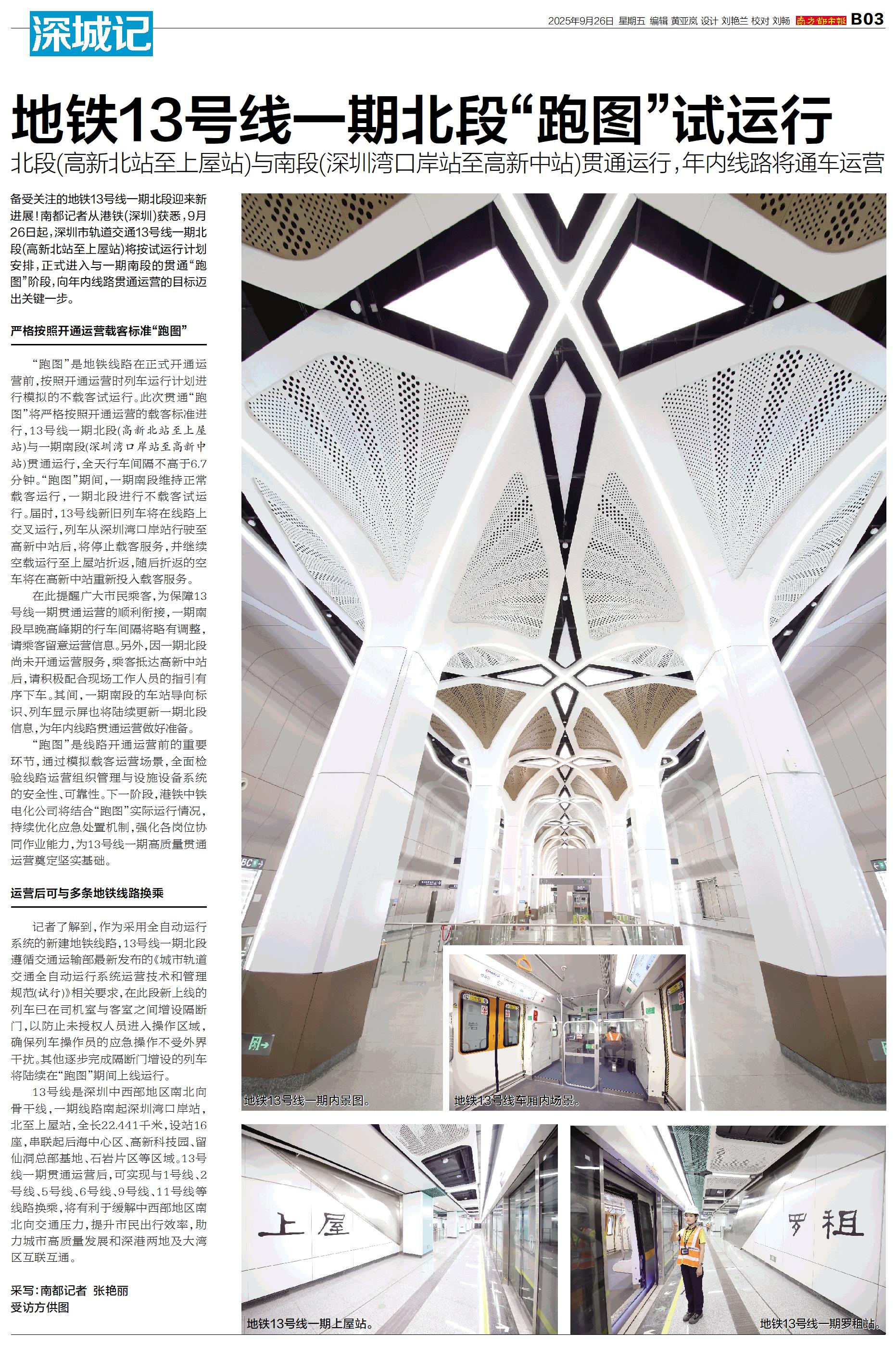 备受关注的地铁13号线一期北段迎来新进展!南都记者从港铁(深圳)获悉,9月26日起,深圳市轨道交通13号线一期北段(高新北站至上屋站)将按试运行计划安排,正式进入与一期南段的贯通“跑图”阶段,向年内线路贯通运营的目标迈出关键一步。