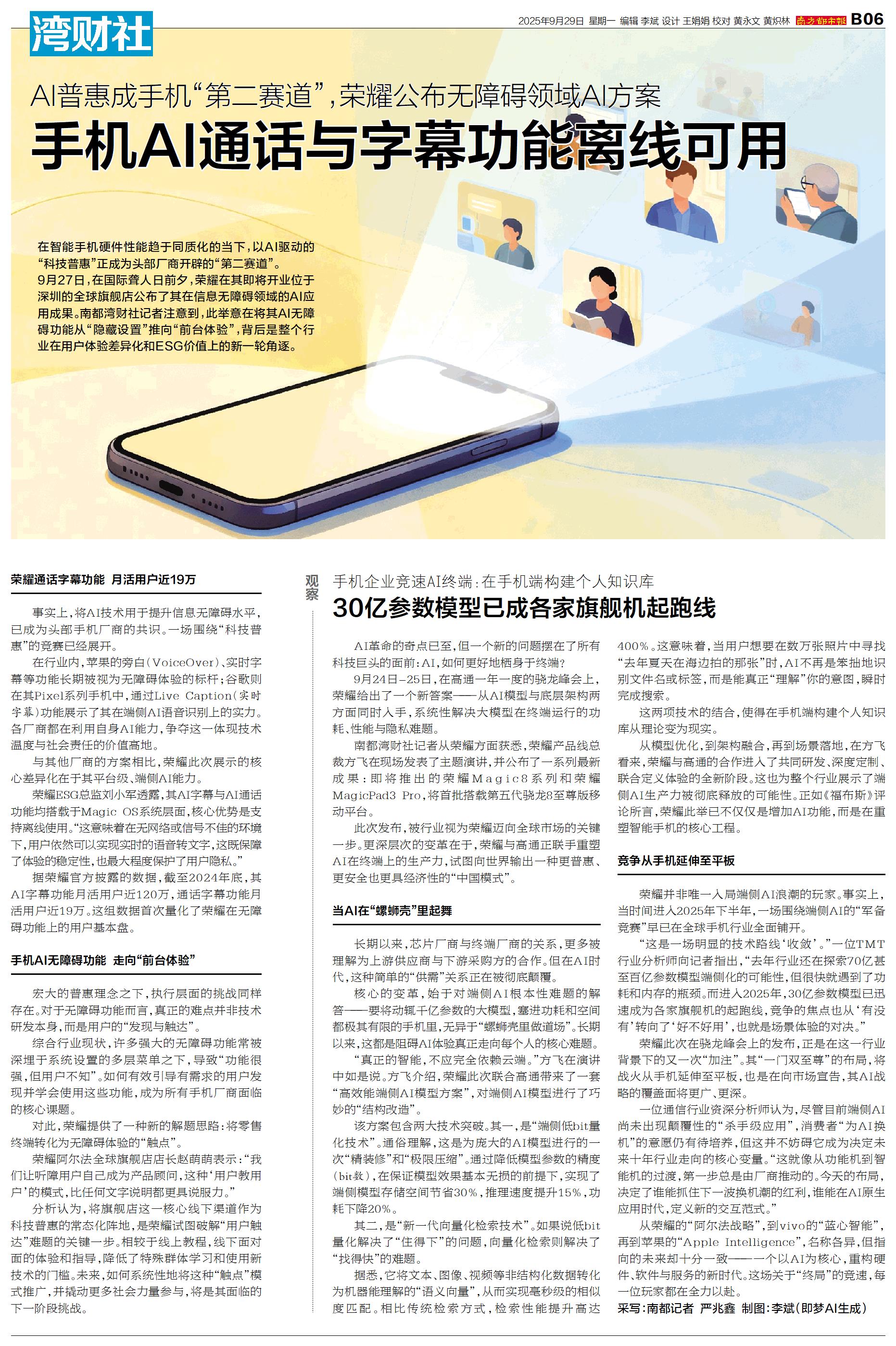 荣耀ESG总监刘小军透露,其AI字幕与AI通话功能均搭载于Magic OS系统层面,核心优势是支持离线使用。“这意味着在无网络或信号不佳的环境下,用户依然可以实现实时的语音转文字,这既保障了体验的稳定性,也最大程度保护了用户隐私。”