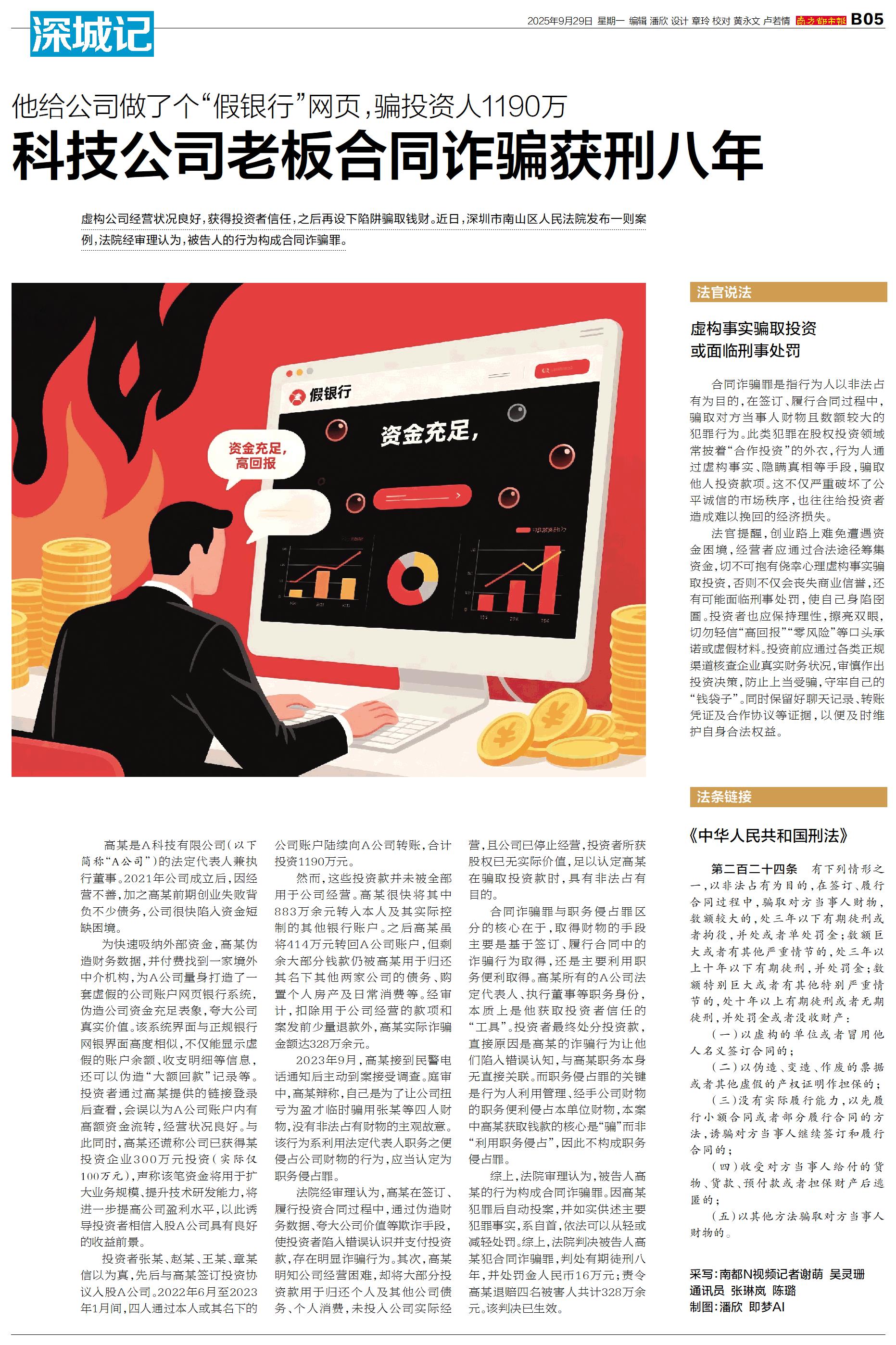 虚构公司经营状况良好,获得投资者信任,之后再设下陷阱骗取钱财。近日,深圳市南山区人民法院发布一则案例,法院经审理认为,被告人的行为构成合同诈骗罪。 高某是A科技有限公司(以下简称“A公司”)的法