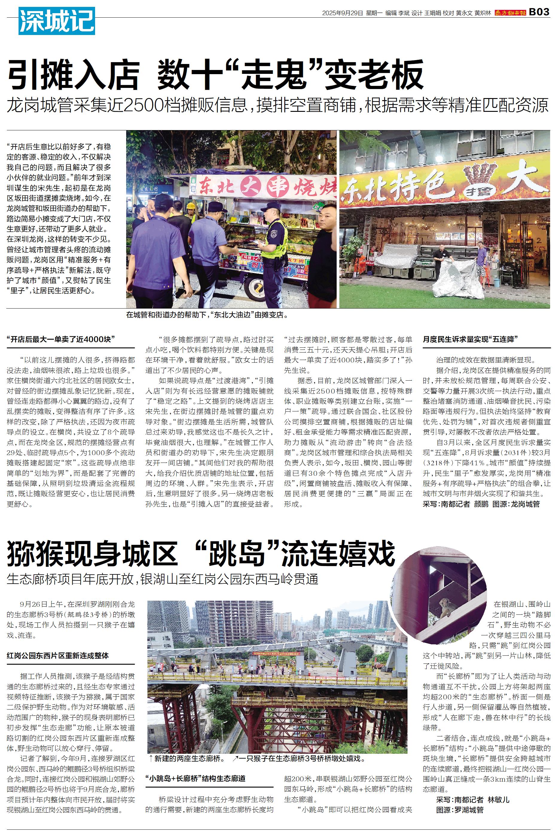 9月26日上午,在深圳罗湖刚刚合龙的生态廊桥3号桥(鲲鹏径3号桥)的桥墩处,现场工作人员拍摄到一只猴子在嬉戏、流连。 红岗公园东西片区重新连成整体 据工作人员推测,该猴子是经结构贯通的