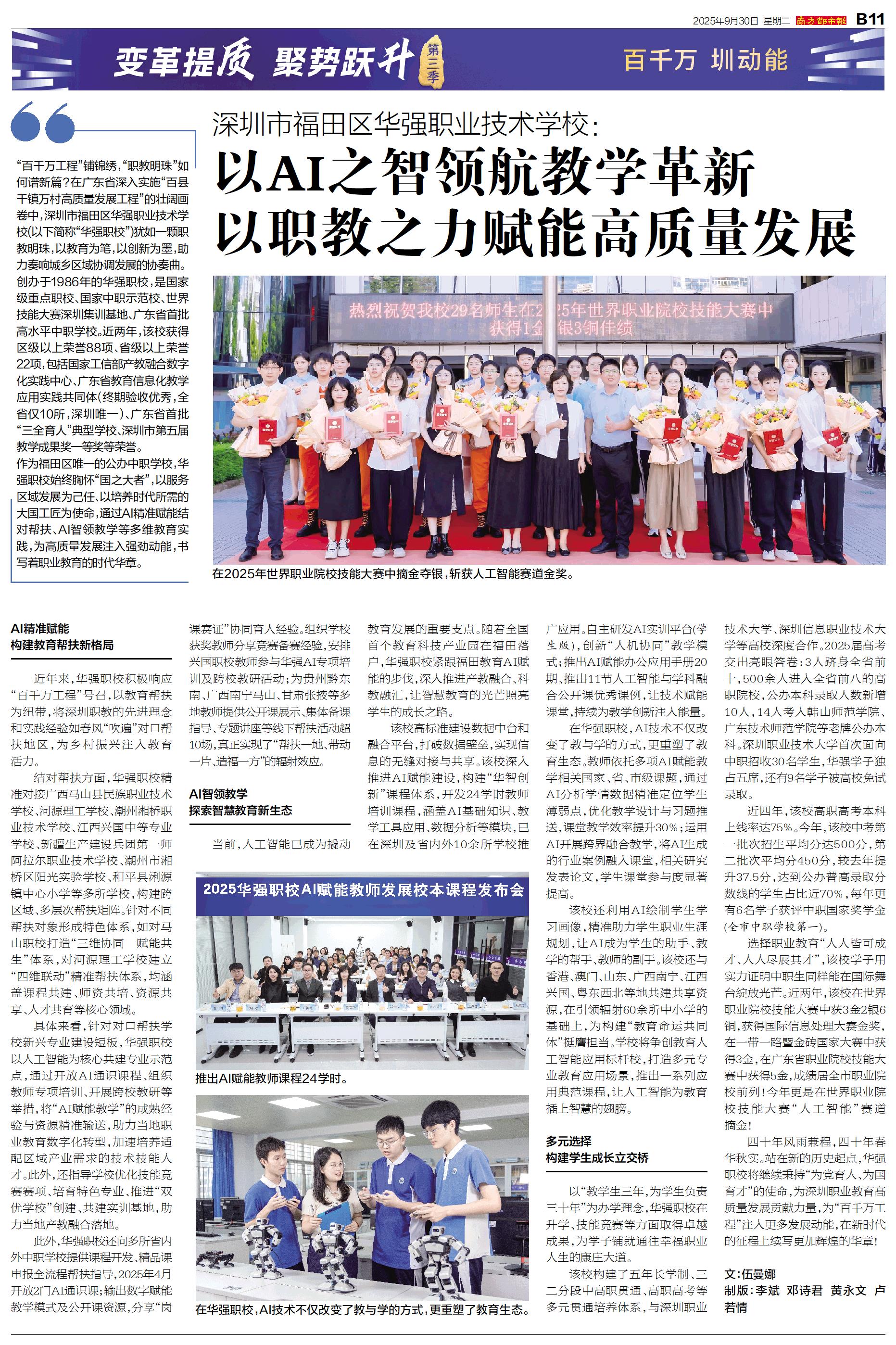 “百千万工程”铺锦绣,“职教明珠”如何谱新篇?在广东省深入实施“百县千镇万村高质量发展工程”的壮阔画卷中,深圳市福田区华强职业技术学校(以下简称“华强职校”)犹如一颗职教明珠,以教育为笔,以创新为