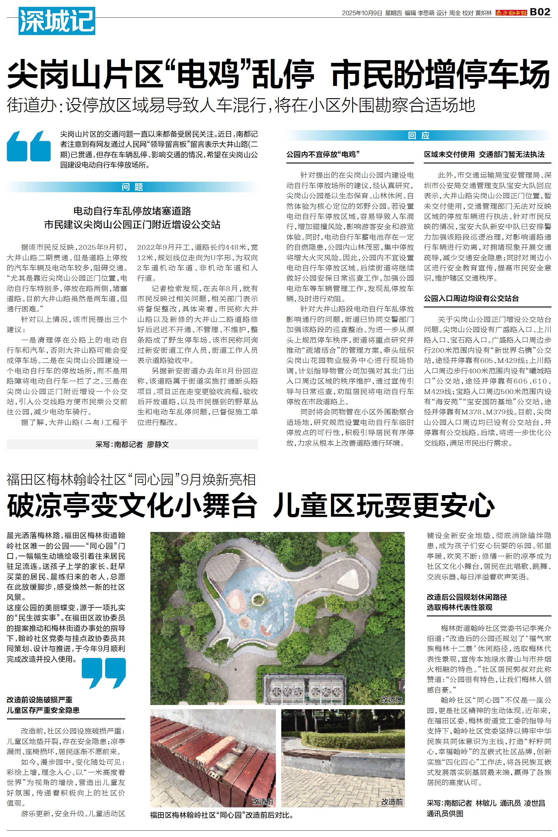 尖岗山片区的交通问题一直以来都备受居民关注。近日,南都记者注意到有网友通过人民网“领导留言板”留言表示大井山路(二期)已贯通,但存在车辆乱停、影响交通的情况,希望在尖岗山公园建设电动自行车停放场所。