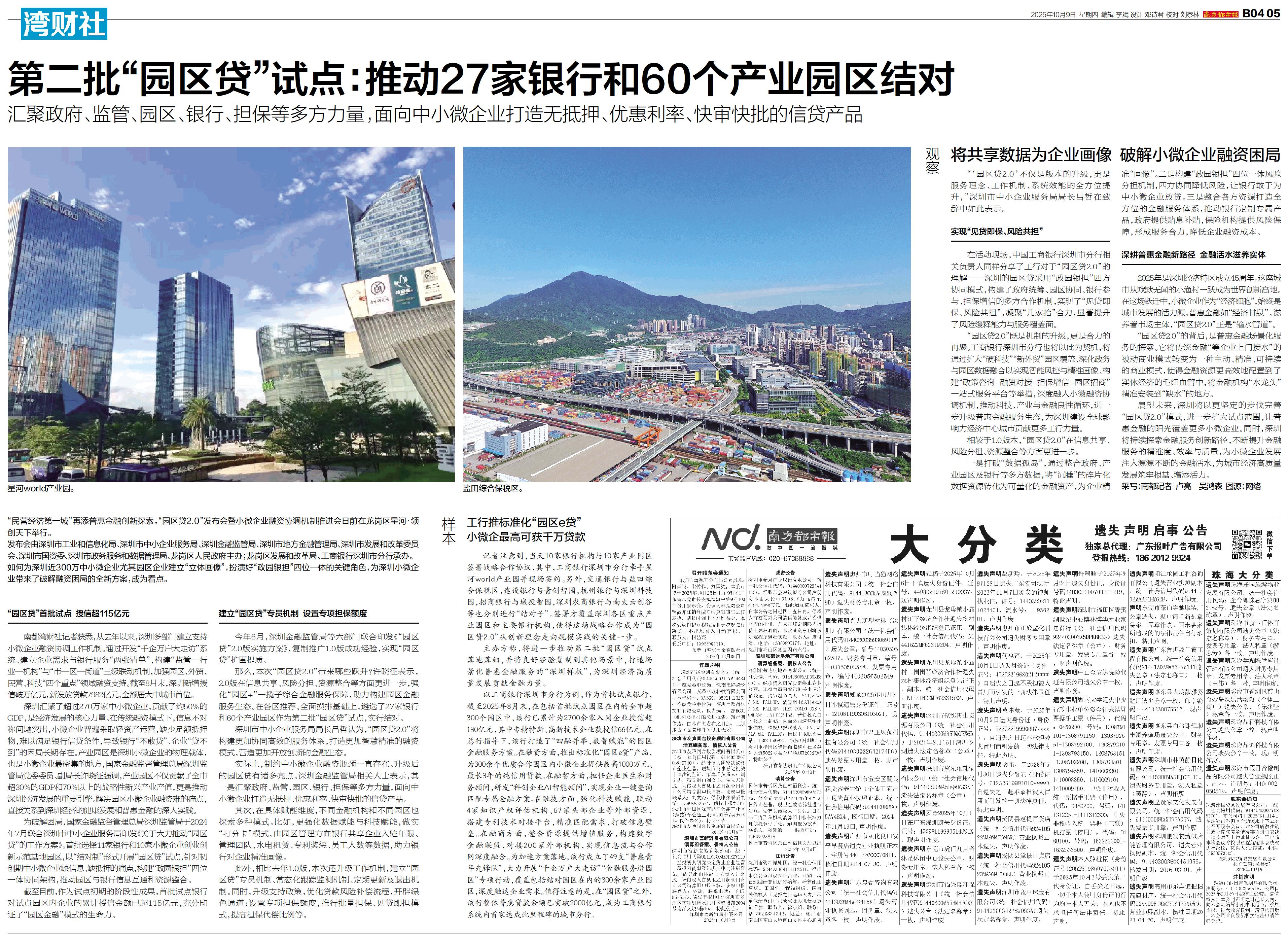 “民营经济第一城”再添普惠金融创新探索。“园区贷2.0”发布会暨小微企业融资协调机制推进会日前在龙岗区星河·领创天下举行。 发布会由深圳市工业和信息化局、深圳市中小企业服务局、深圳金融监管局、深