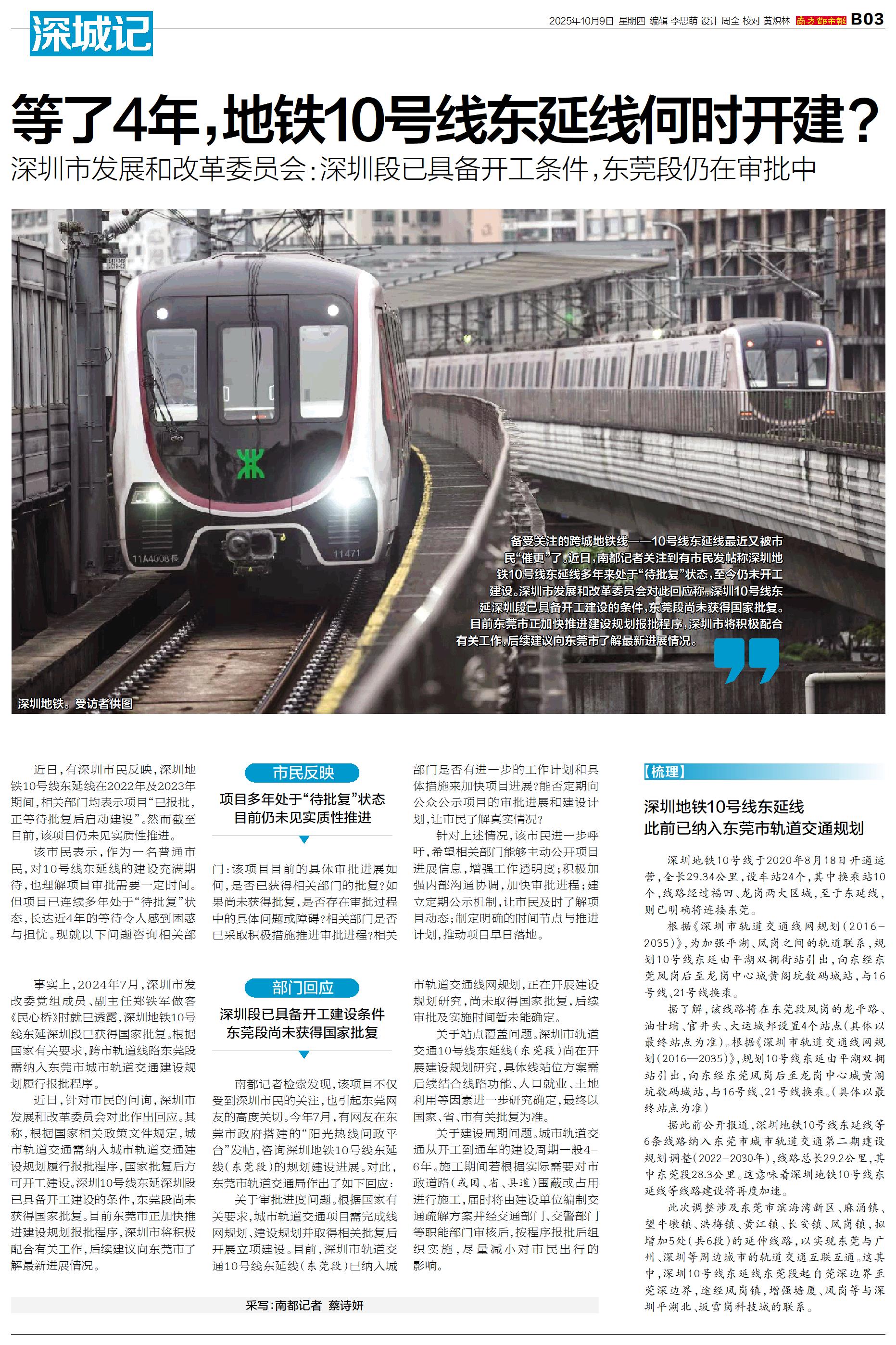 备受关注的跨城地铁线——10号线东延线最近又被市民“催更”了。近日,南都记者关注到有市民发帖称深圳地铁10号线东延线多年来处于“待批复”状态,至今仍未开工建设。深圳市发展和改革委员会对此回应称,深