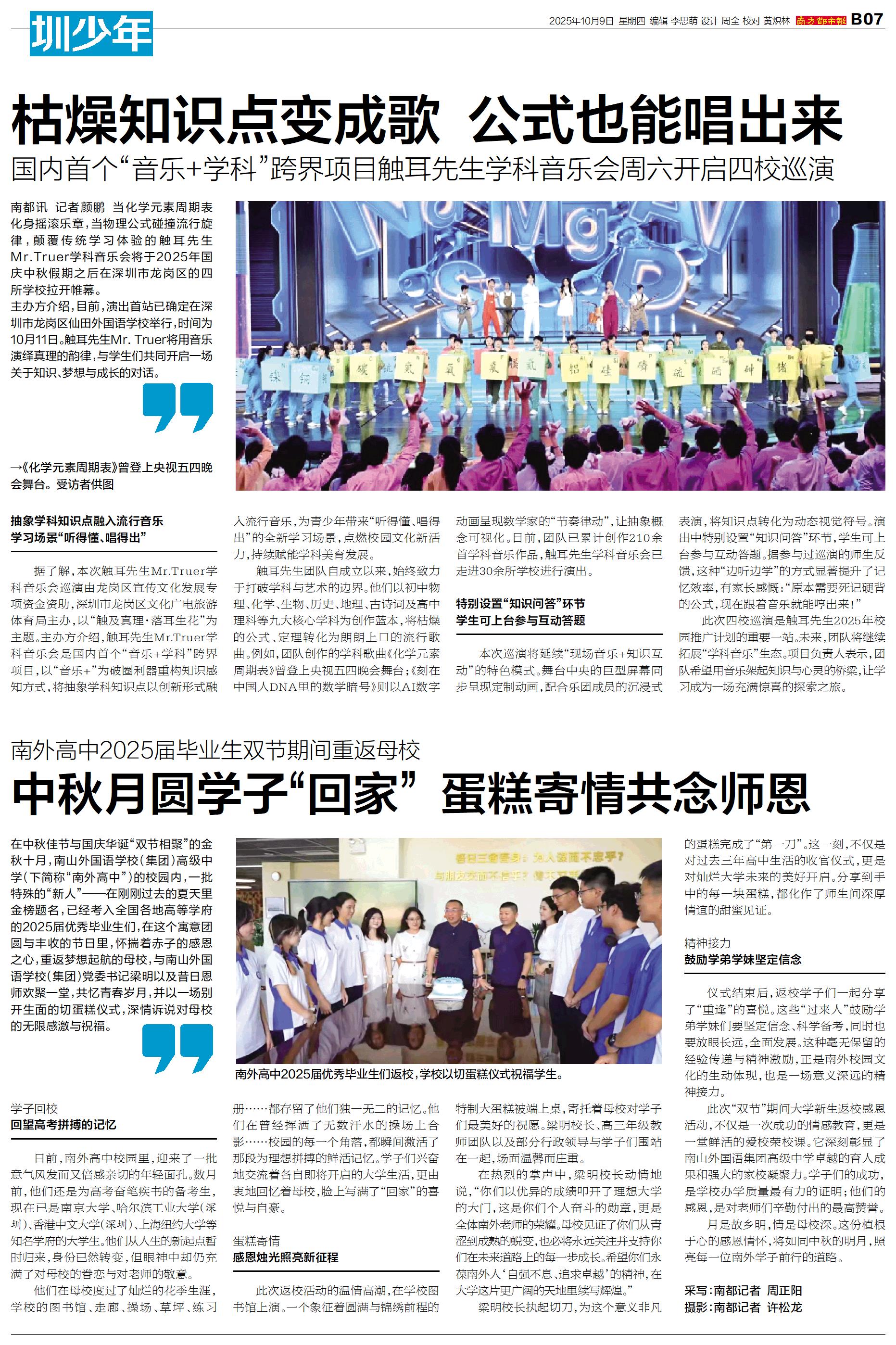 南都讯 记者颜鹏 当化学元素周期表化身摇滚乐章,当物理公式碰撞流行旋律,颠覆传统学习体验的触耳先生Mr.Truer学科音乐会将于2025年国庆中秋假期之后在深圳市龙岗区的四所学校拉开帷幕。 主办