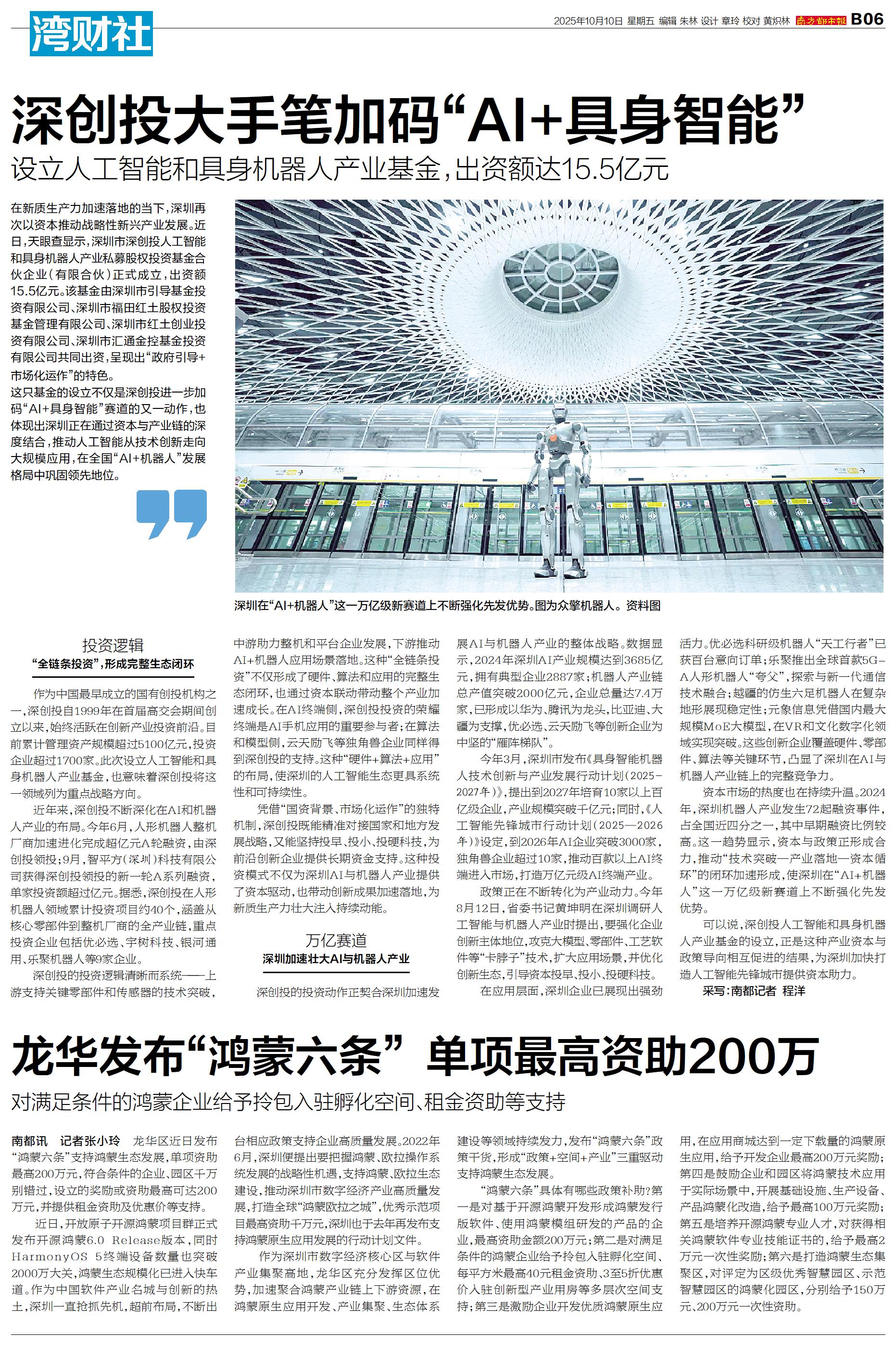 在新质生产力加速落地的当下,深圳再次以资本推动战略性新兴产业发展。近日,天眼查显示,深圳市深创投人工智能和具身机器人产业私募股权投资基金合伙企业(有限合伙)正式成立,出资额15.5亿元。该基金由深