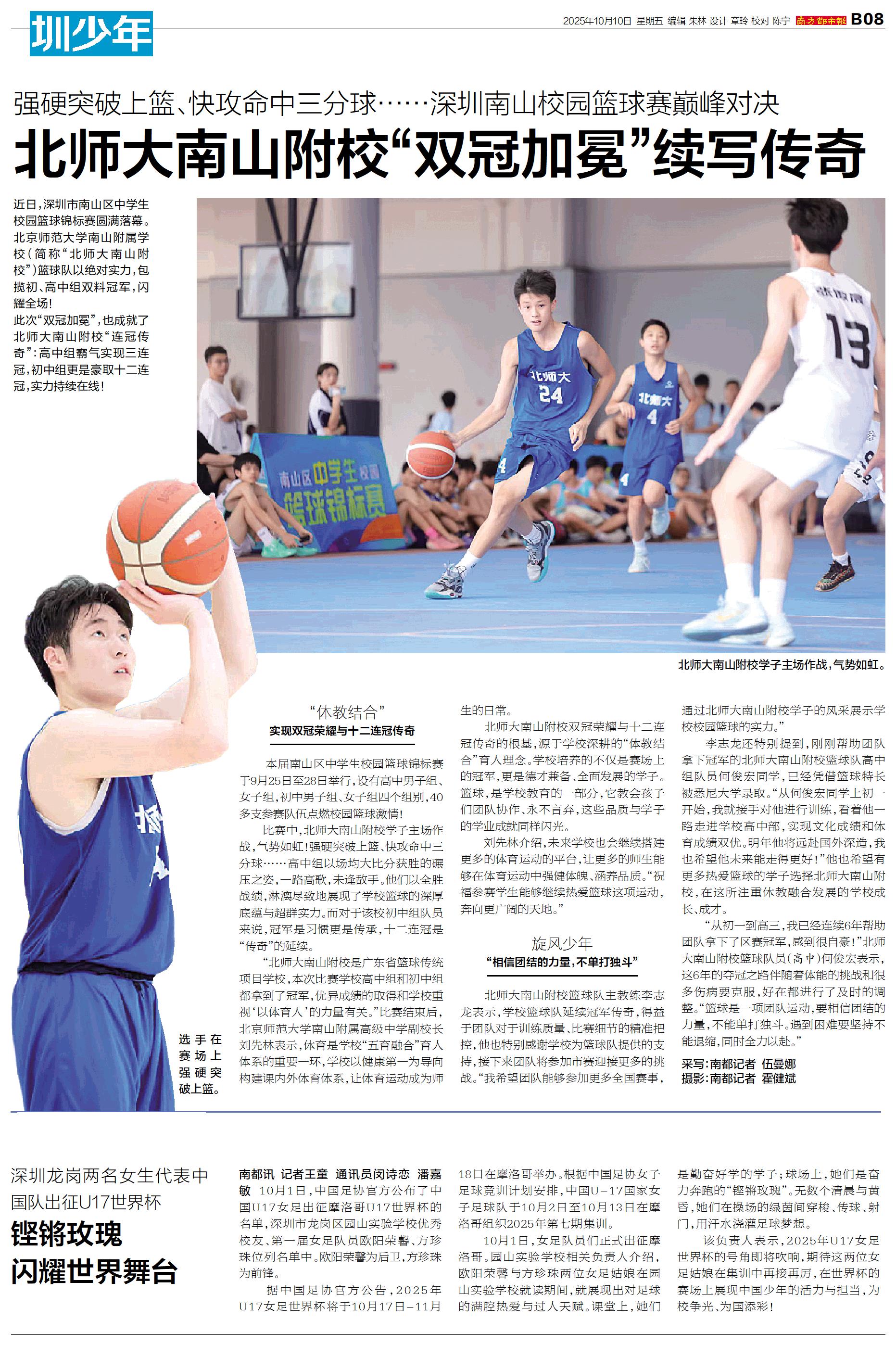 近日,深圳市南山区中学生校园篮球锦标赛圆满落幕。北京师范大学南山附属学校(简称“北师大南山附校”)篮球队以绝对实力,包揽初、高中组双料冠军,闪耀全场! 此次“双冠加冕”,也成就了北师大南山附校“