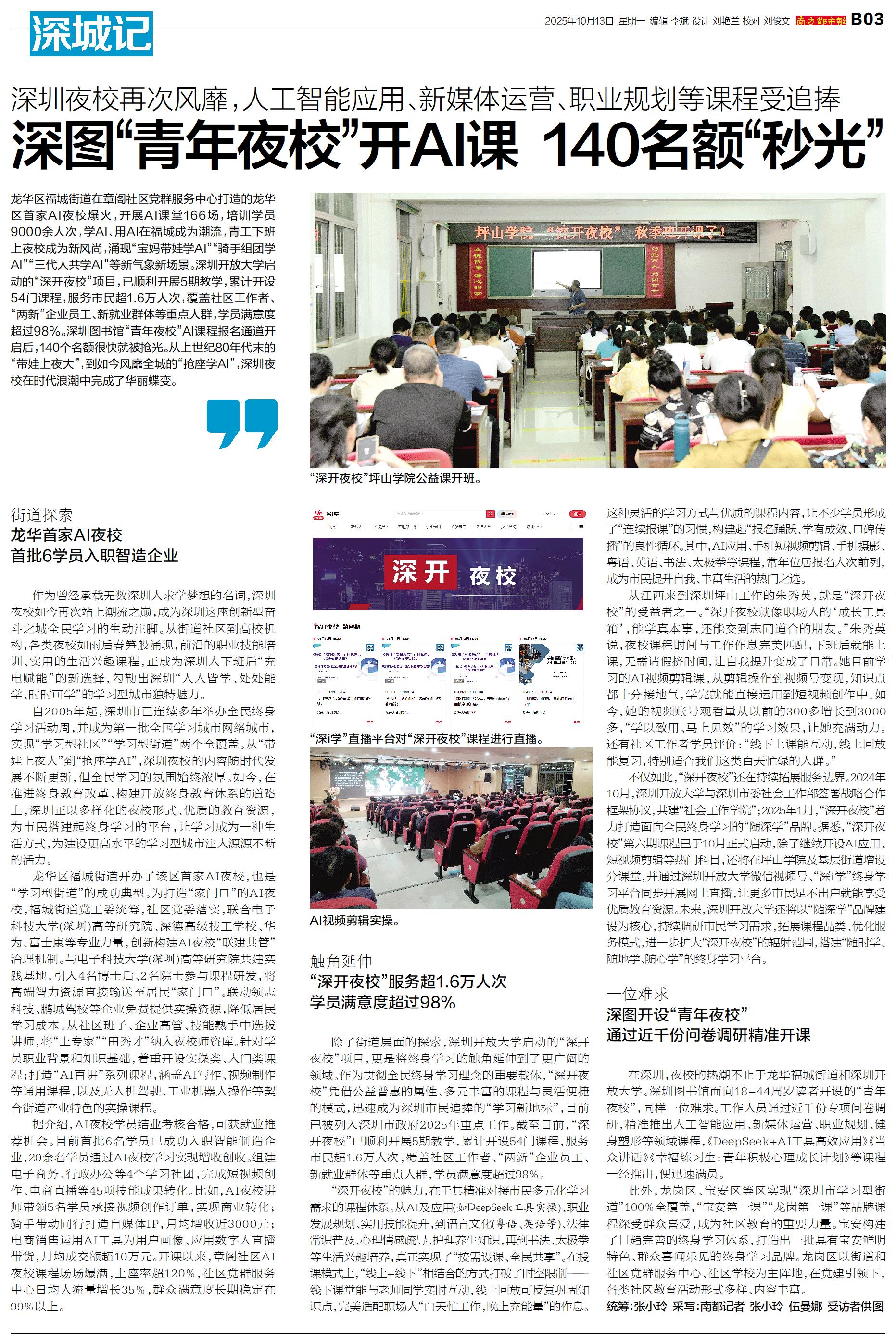 龙华区福城街道在章阁社区党群服务中心打造的龙华区首家AI夜校爆火,开展AI课堂166场,培训学员9000余人次,学AI、用AI在福城成为潮流,青工下班上夜校成为新风尚,涌现“宝妈带娃学AI”“骑手