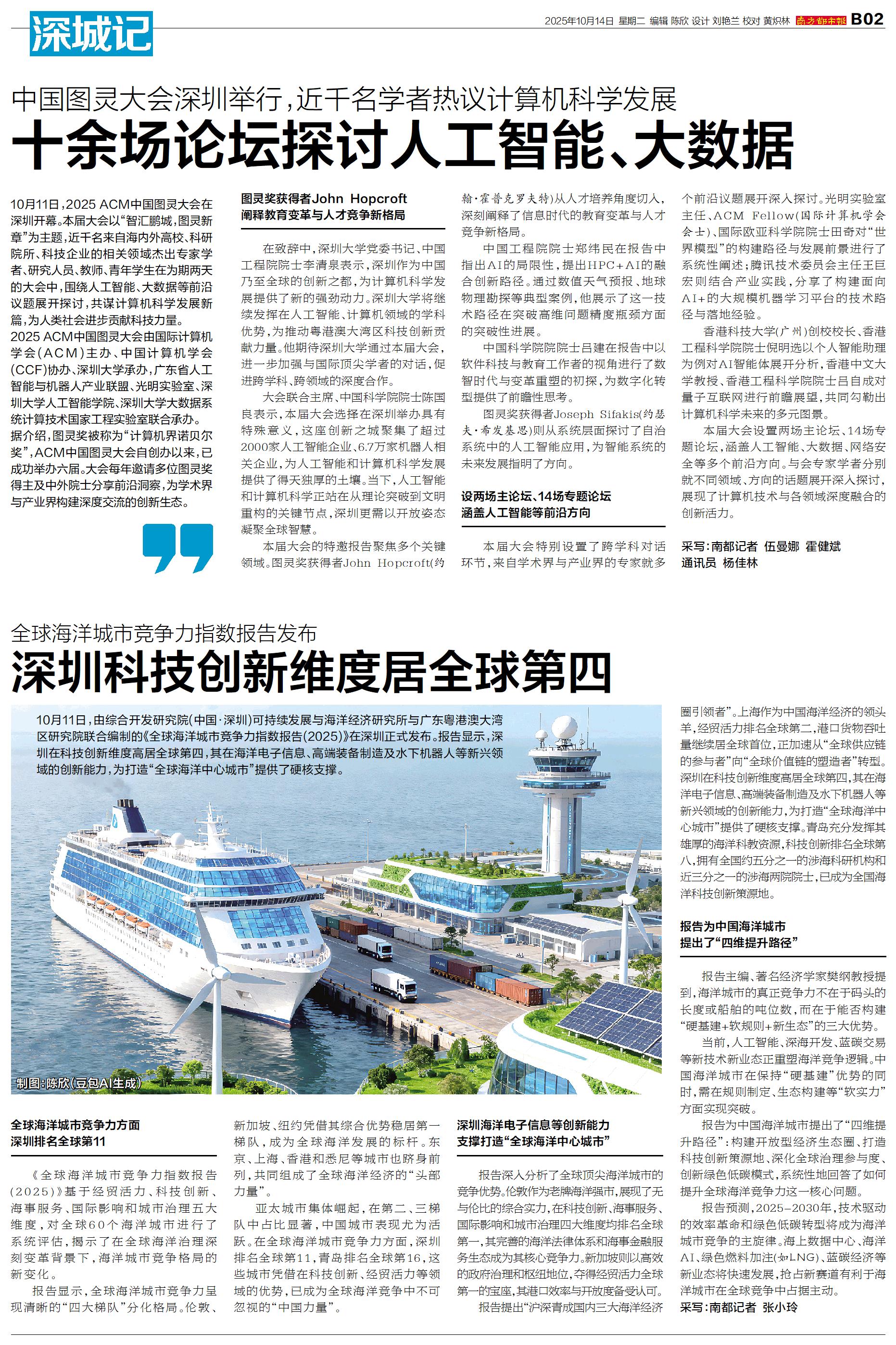 10月11日,由综合开发研究院(中国·深圳)可持续发展与海洋经济研究所与广东粤港澳大湾区研究院联合编制的《全球海洋城市竞争力指数报告(2025)》在深圳正式发布。报告显示,深圳在科技创新维度高居全