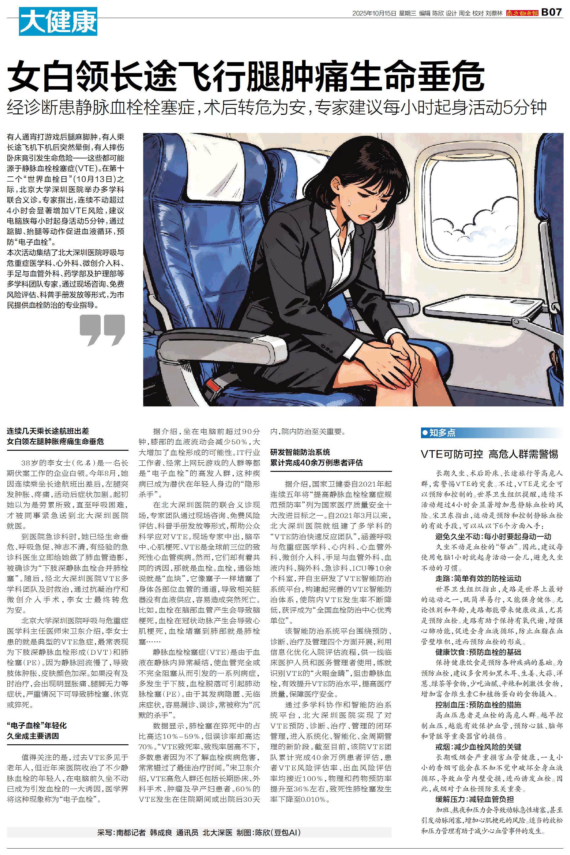 有人通宵打游戏后腿麻脚肿,有人乘长途飞机下机后突然晕倒,有人摔伤卧床竟引发生命危险——这些都可能源于静脉血栓栓塞症(VTE)。在第十二个“世界血栓日”(10月13日)之际,北京大学深圳医院举办多学