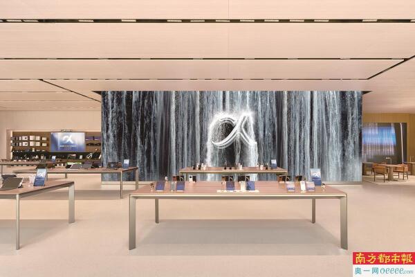 以荣耀阿尔法旗舰店为例,国庆期间,记者在现场看到,其内部设计语言强调“无边界”与“人文科技”。43米长的曲面玻璃,自二楼倾泻而下的9米高室内瀑布,以及“鹦鹉螺形态”的旋转楼梯,构成了一个开放、松弛的公共空间,而非带有强烈销售目的的卖场。