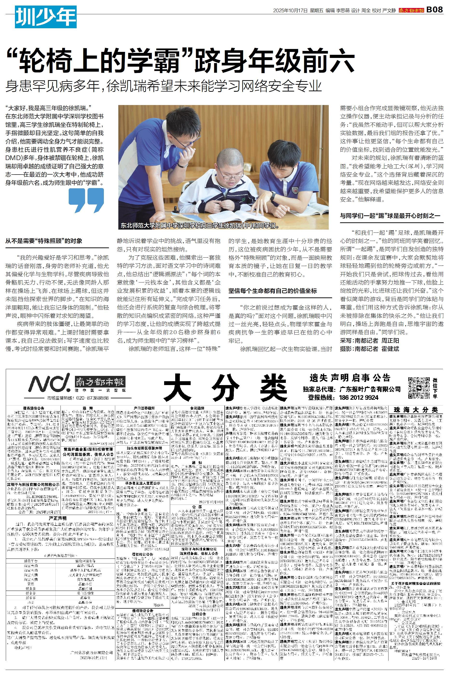 “大家好,我是高三年级的徐凯瑞。” 在东北师范大学附属中学深圳学校图书馆里,高三学生徐凯瑞坐在特制轮椅上,手指微颤却目光坚定。这句简单的自我介绍,他需要调动全身力气才能说完整。 身患杜氏进行性