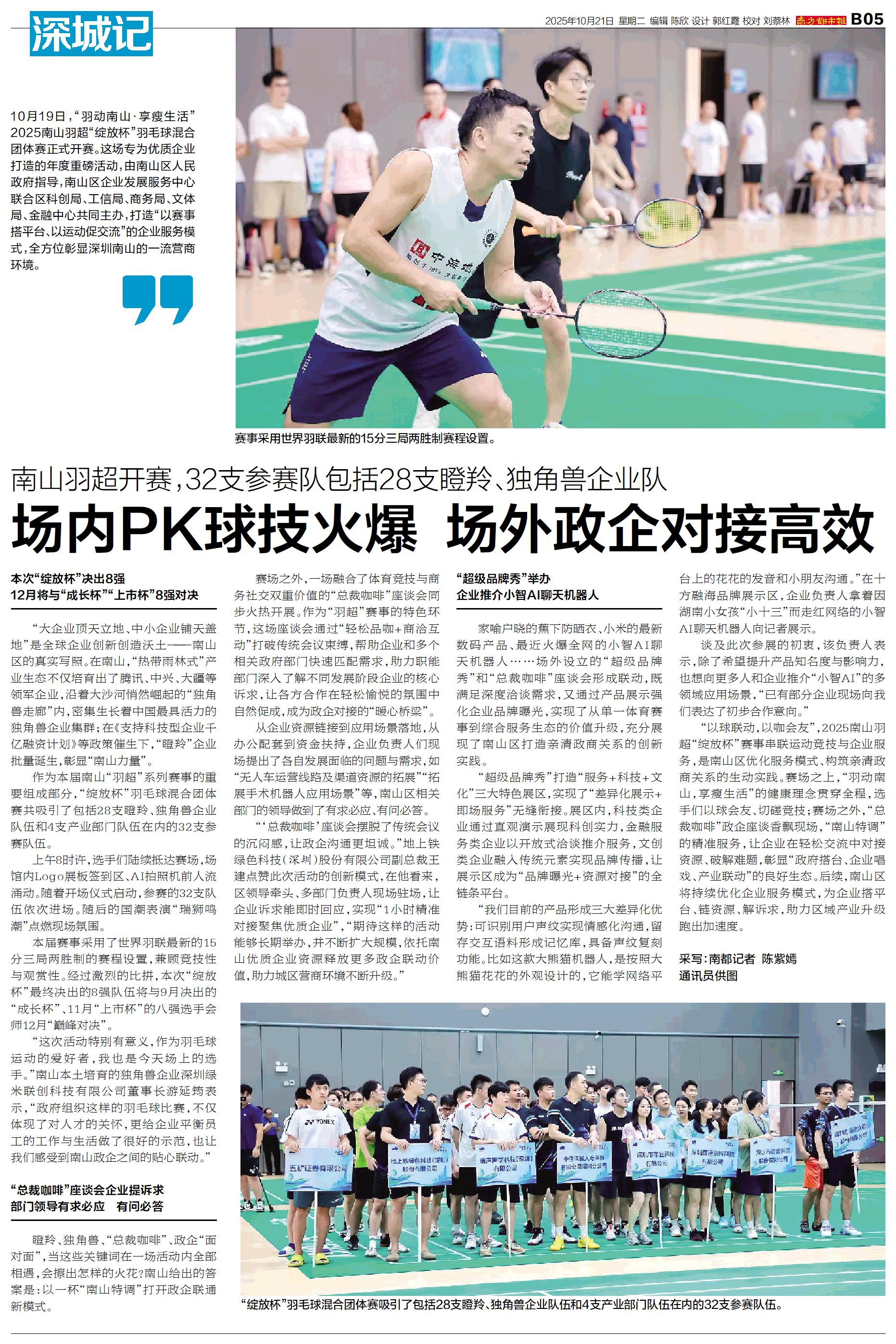 10月19日,“羽动南山·享瘦生活”2025南山羽超“绽放杯”羽毛球混合团体赛正式开赛。这场专为优质企业打造的年度重磅活动,由南山区人民政府指导,南山区企业发展服务中心联合区科创局、工信局、商务局