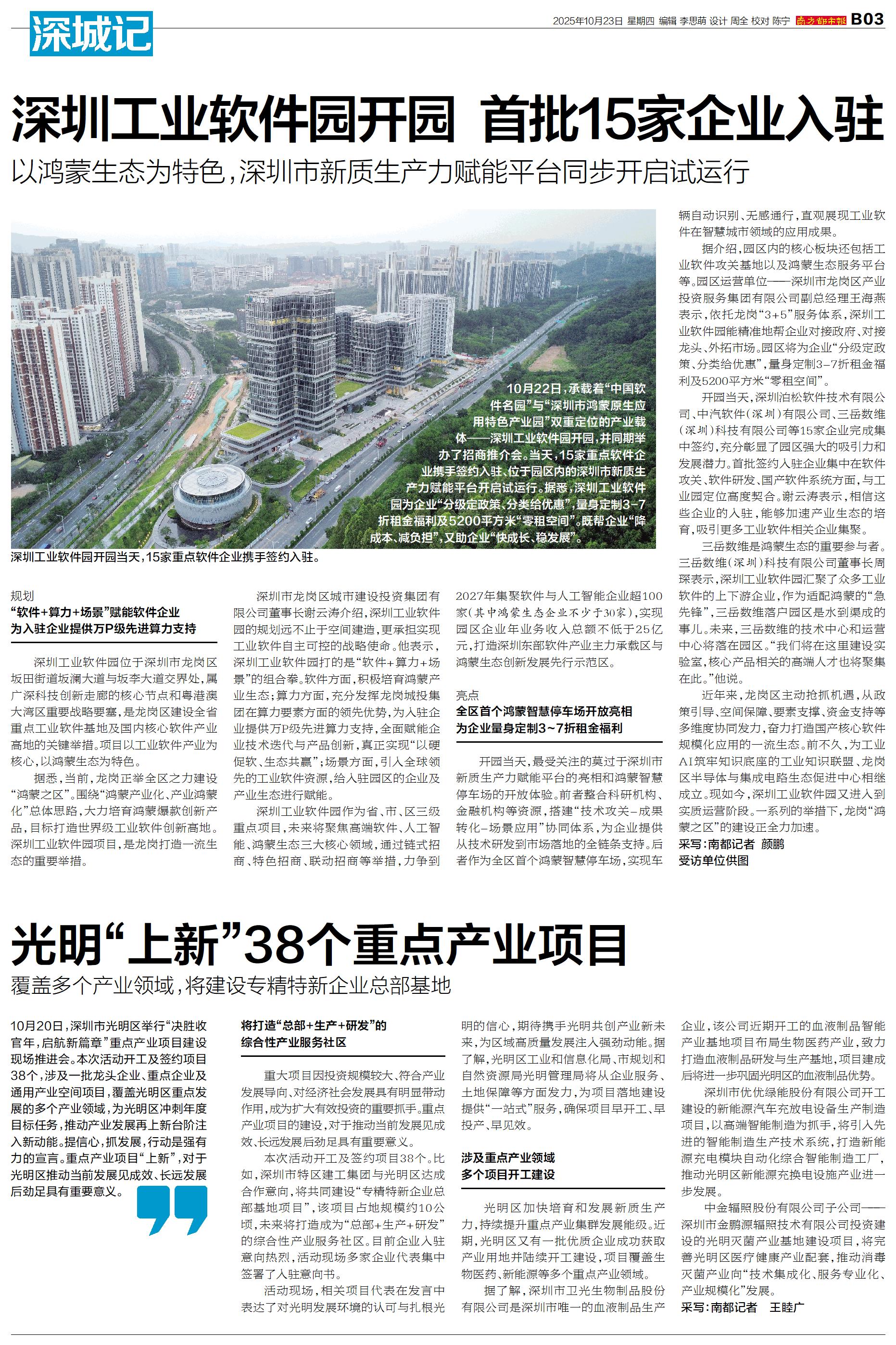 10月20日,深圳市光明区举行“决胜收官年,启航新篇章”重点产业项目建设现场推进会。本次活动开工及签约项目38个,涉及一批龙头企业、重点企业及通用产业空间项目,覆盖光明区重点发展的多个产业领域,为