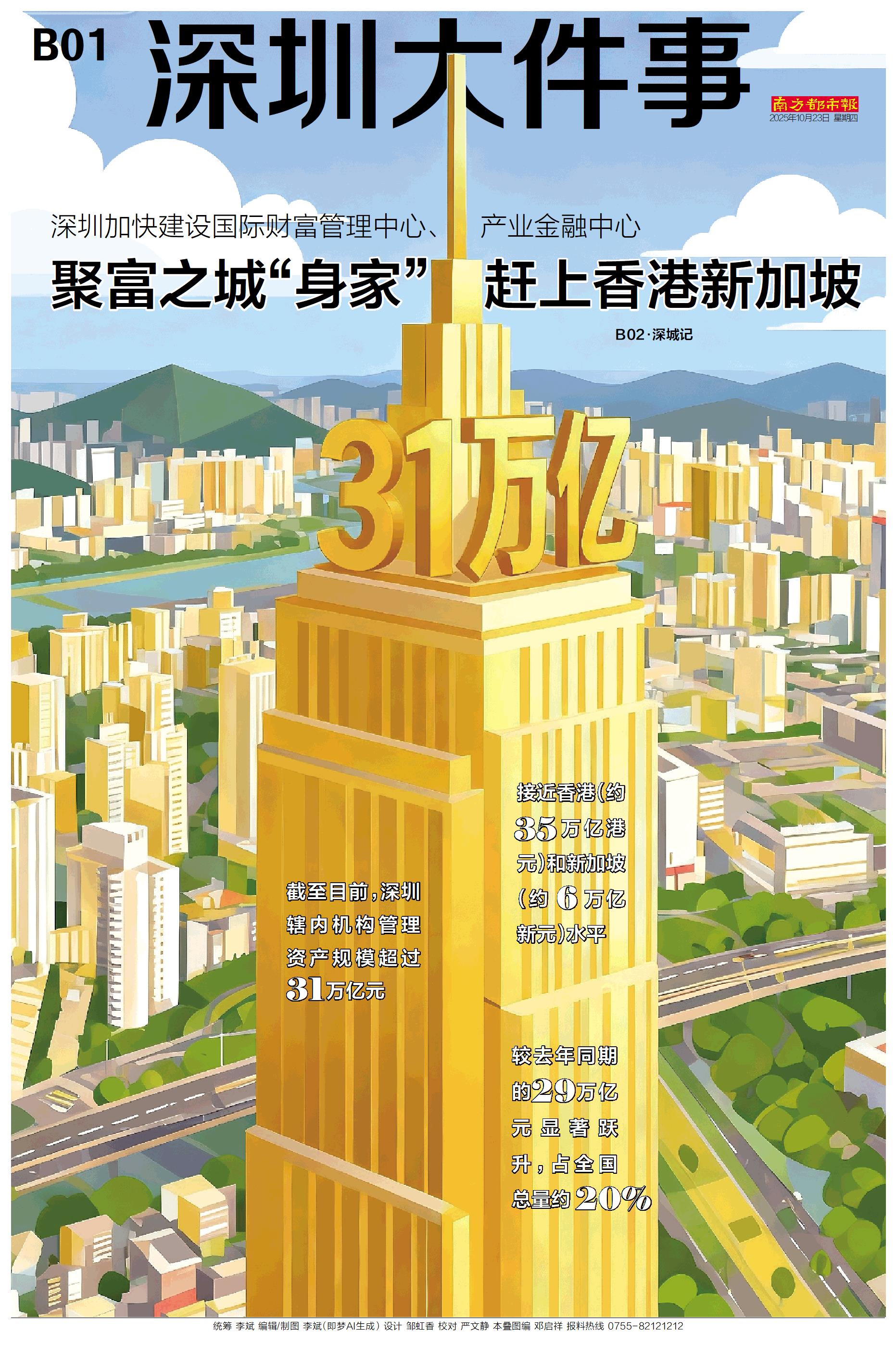 截至目前,深圳辖内机构管理资产规模超过31万亿元 接近香港(约35万亿港元)和新加坡(约6万亿新元)水平 较去年同期的29万亿元显著跃升,占全国总量约20% B02·深城记