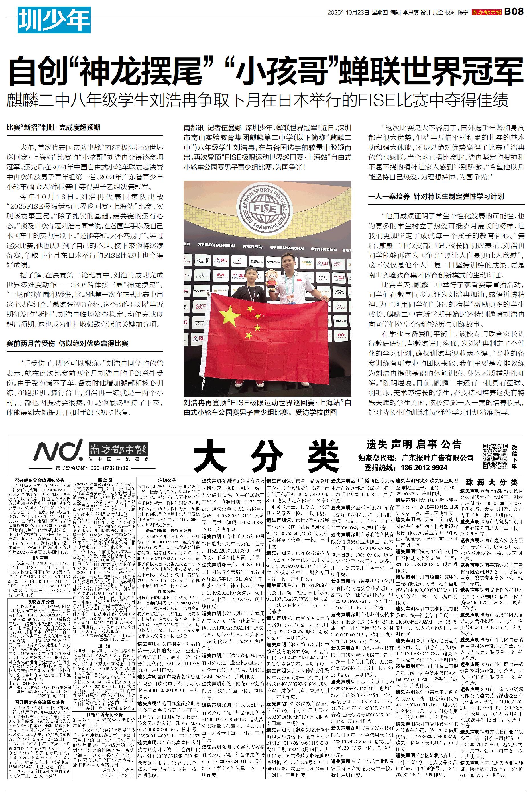南都讯 记者伍曼娜 深圳少年,蝉联世界冠军!近日,深圳市南山实验教育集团麒麟第二中学(以下简称“麒麟二中”)八年级学生刘浩冉,在与各国选手的较量中脱颖而出,再次登顶“FISE极限运动世界巡回赛·上