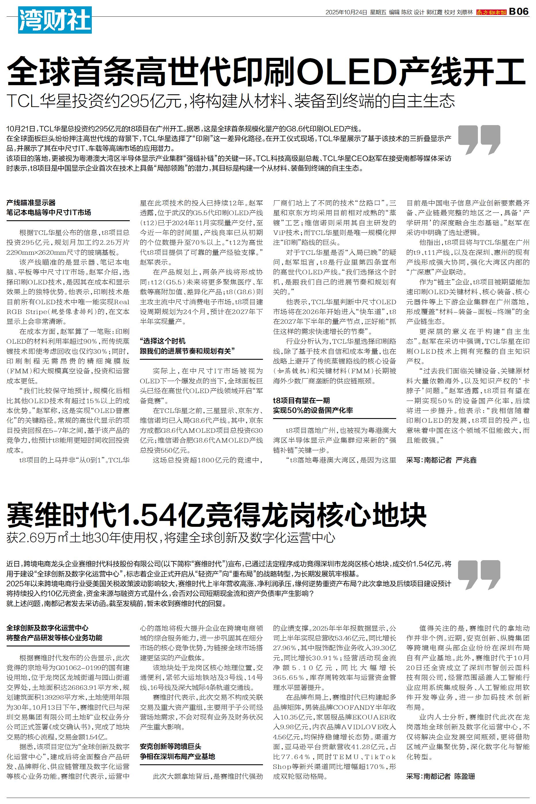 10月21日,TCL华星总投资约295亿元的t8项目在广州开工。据悉,这是全球首条规模化量产的G8.6代印刷OLED产线。 在全球面板巨头纷纷押注高世代线的背景下,TCL华星选择了“印刷”这一差