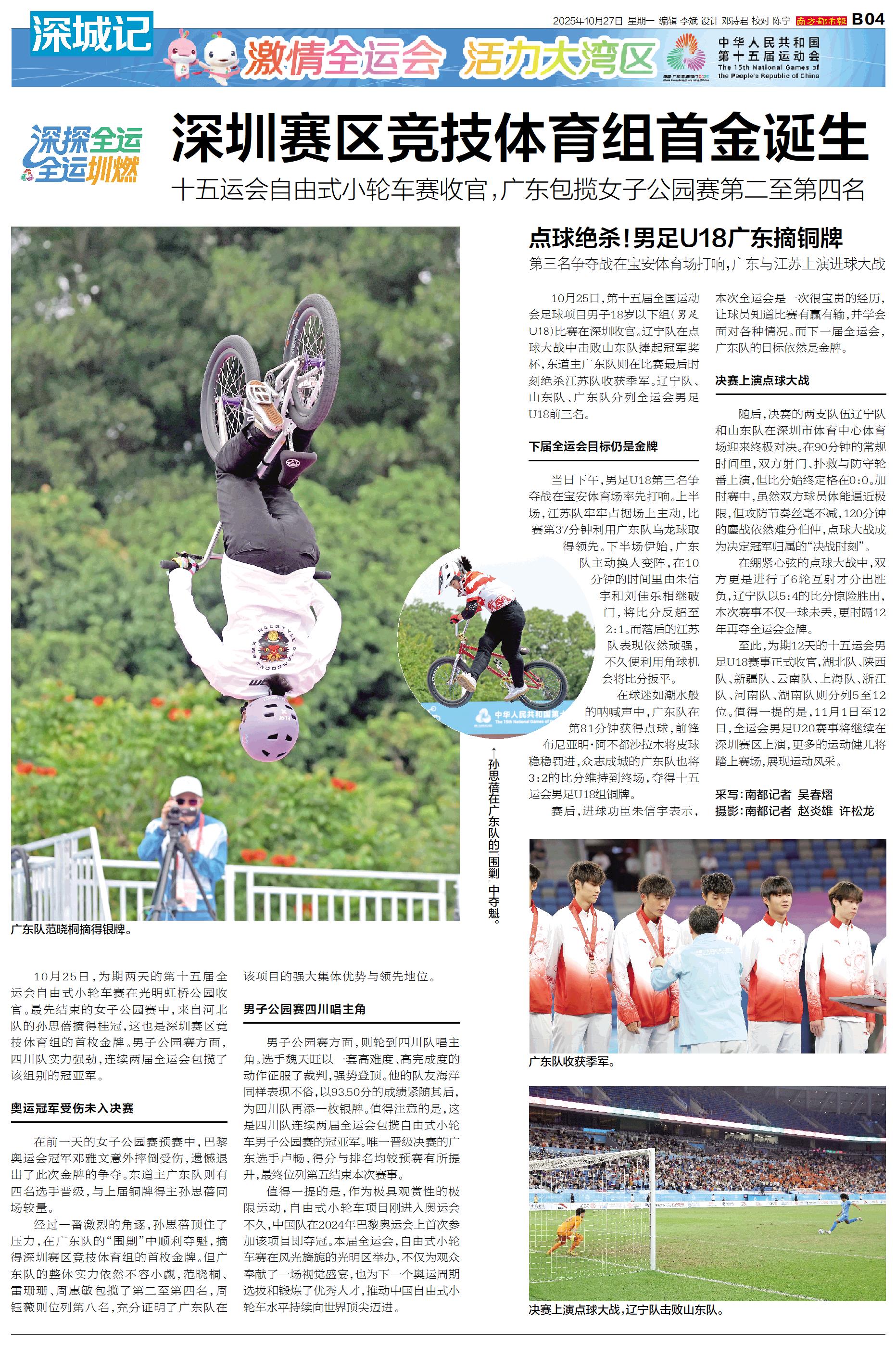 10月25日,为期两天的第十五届全运会自由式小轮车赛在光明虹桥公园收官。最先结束的女子公园赛中,来自河北队的孙思蓓摘得桂冠,这也是深圳赛区竞技体育组的首枚金牌。男子公园赛方面,四川队实力强劲,连续