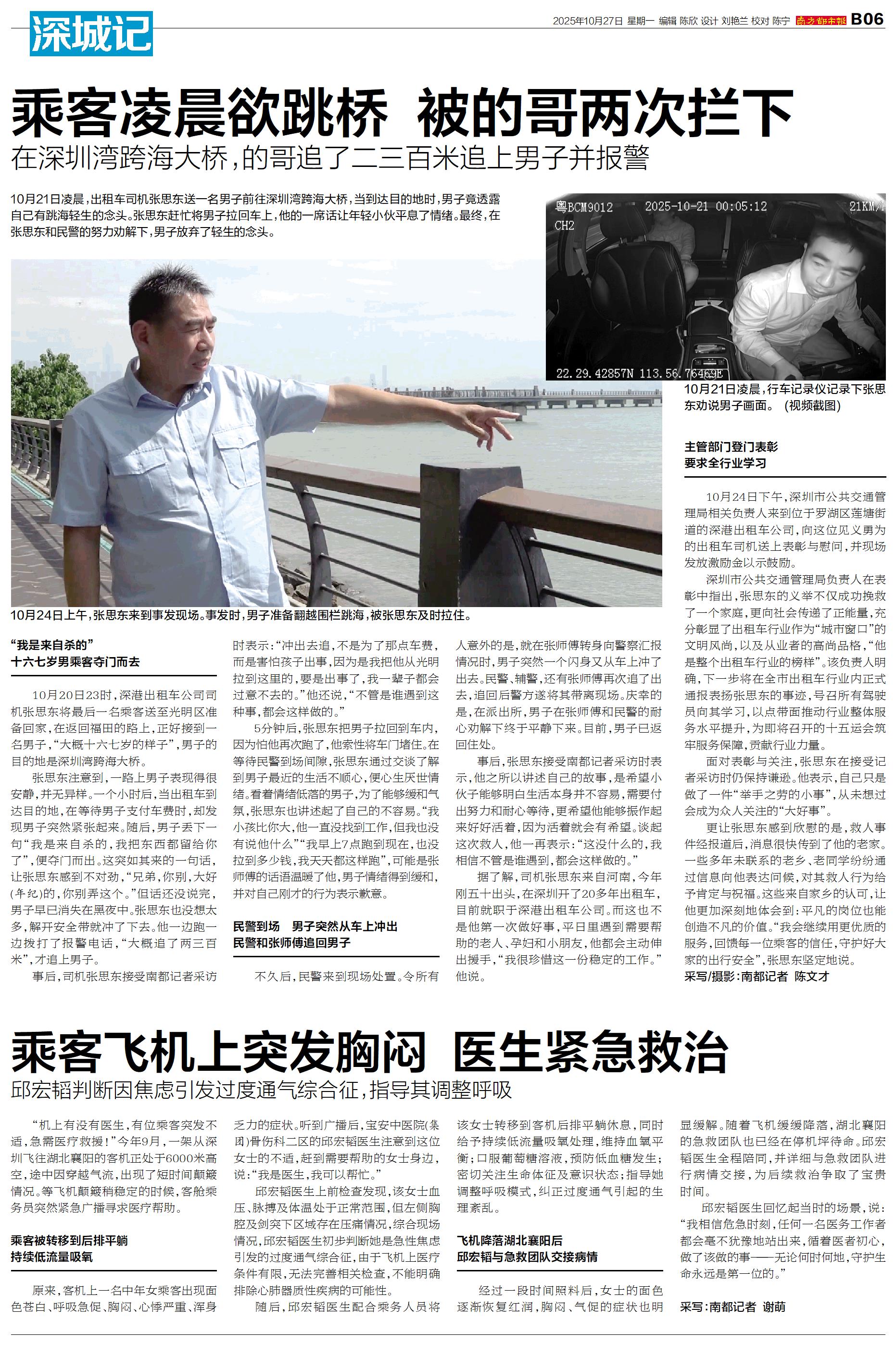 10月21日凌晨,出租车司机张思东送一名男子前往深圳湾跨海大桥,当到达目的地时,男子竟透露自己有跳海轻生的念头。张思东赶忙将男子拉回车上,他的一席话让年轻小伙平息了情绪。最终,在张思东和民警的努力