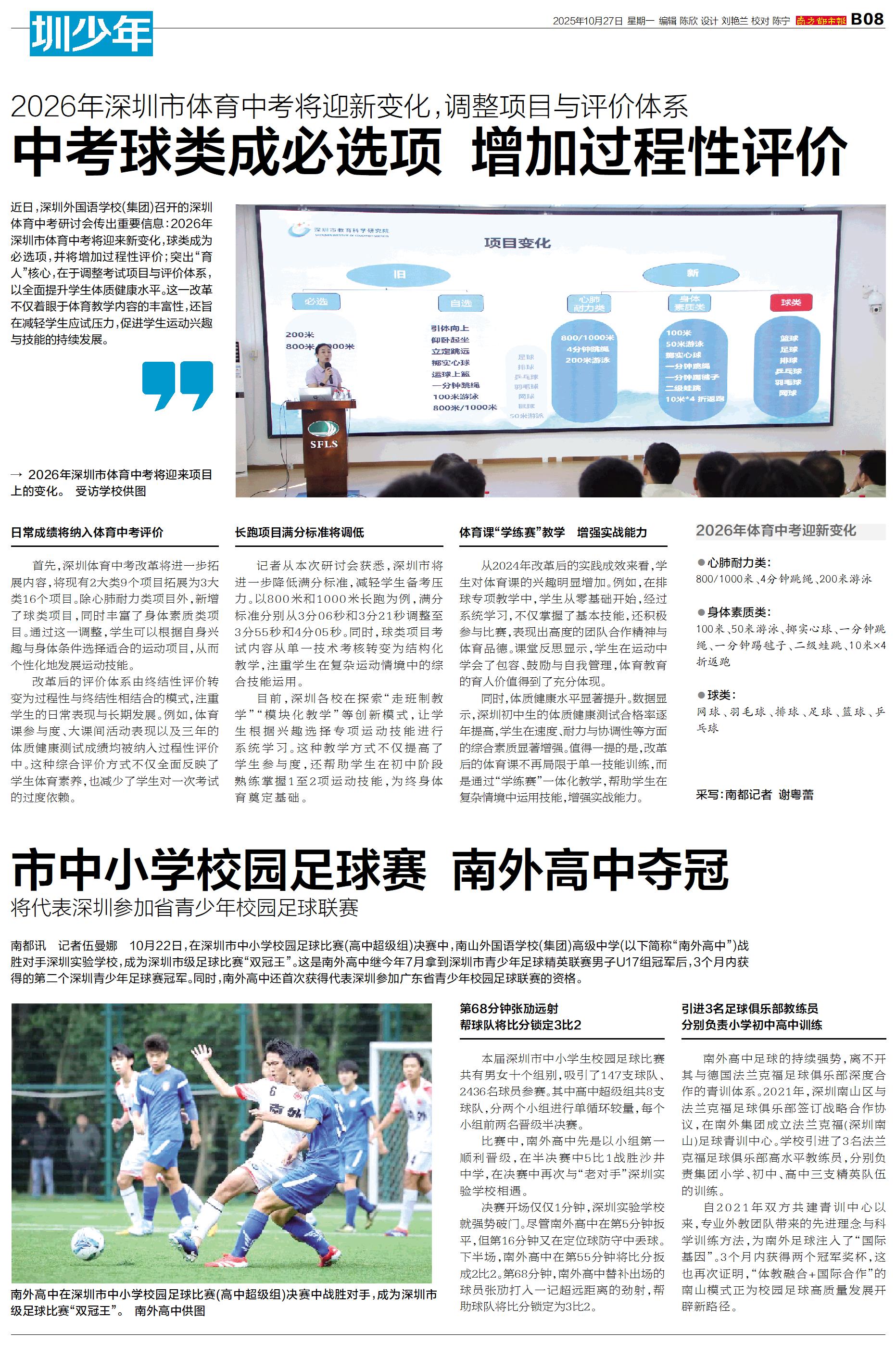 近日,深圳外国语学校(集团)召开的深圳体育中考研讨会传出重要信息:2026年深圳市体育中考将迎来新变化,球类成为必选项,并将增加过程性评价;突出“育人”核心,在于调整考试项目与评价体系,以全面提升