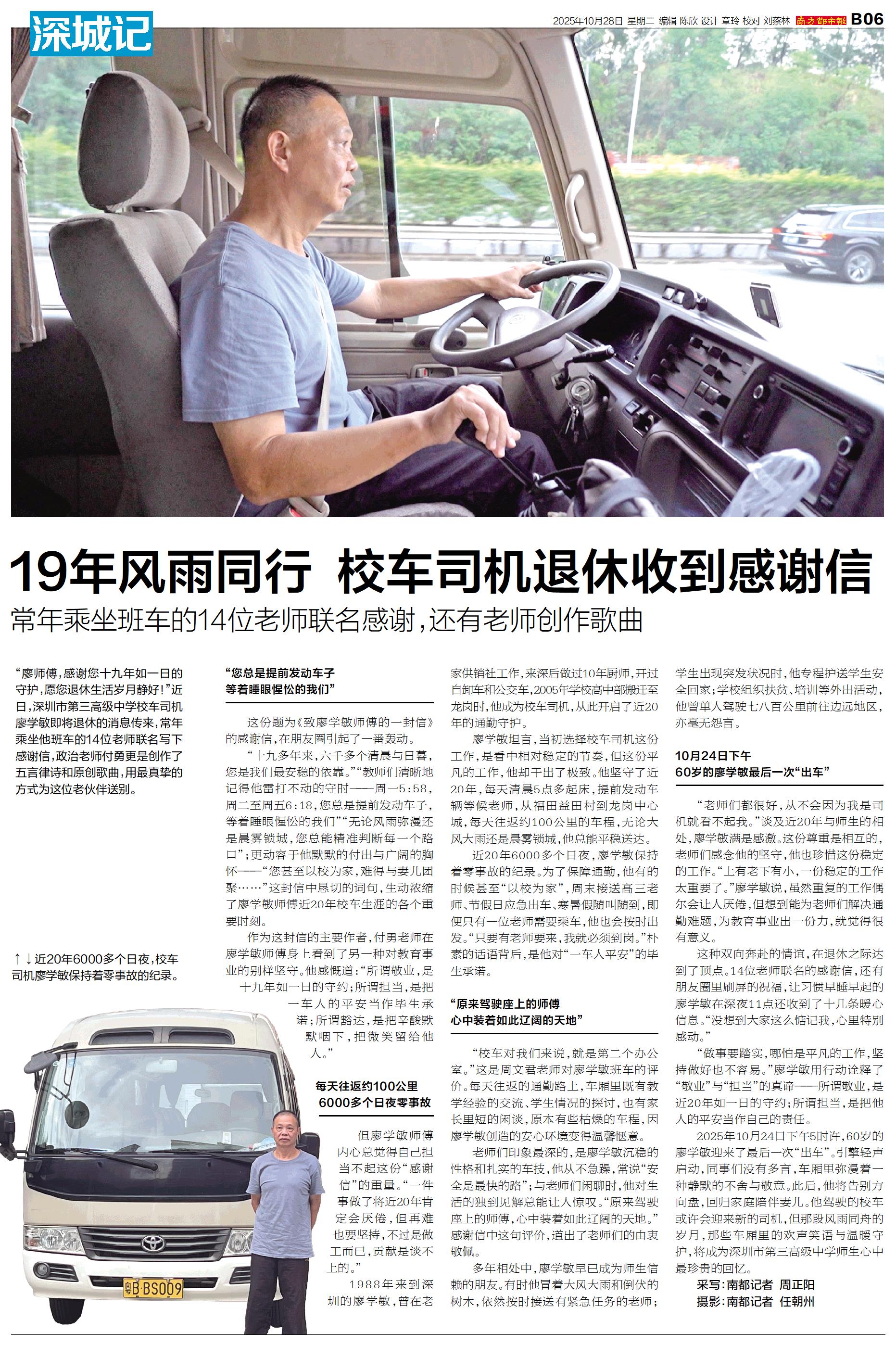 “廖师傅,感谢您十九年如一日的守护,愿您退休生活岁月静好!”近日,深圳市第三高级中学校车司机廖学敏即将退休的消息传来,常年乘坐他班车的14位老师联名写下感谢信,政治老师付勇更是创作了五言律诗和原创
