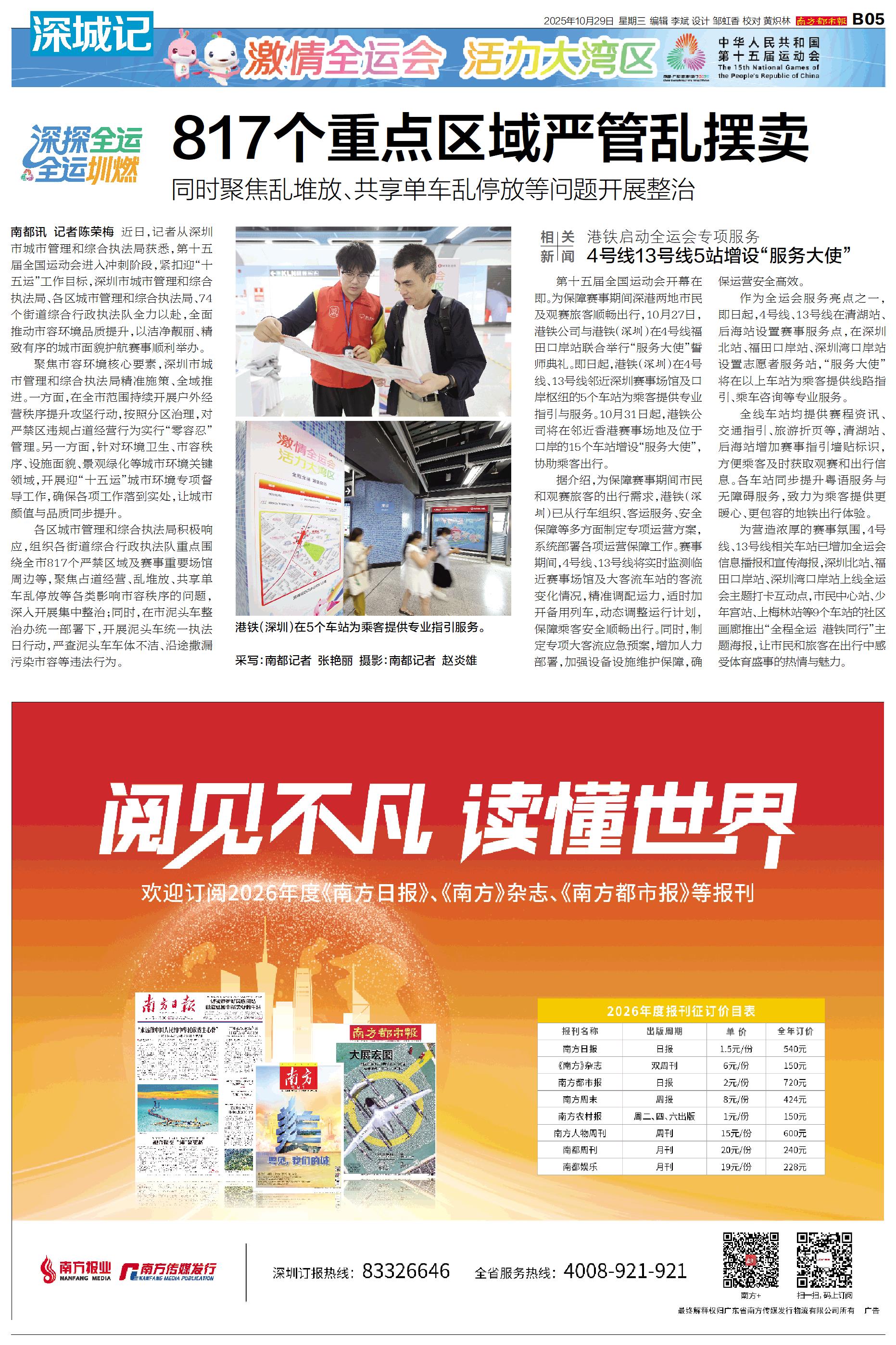 相关新闻 第十五届全国运动会开幕在即。为保障赛事期间深港两地市民及观赛旅客顺畅出行,10月27日,港铁公司与港铁(深圳)在4号线福田口岸站联合举行“服务大使”誓师典礼。即日起,港铁(深圳)在4号