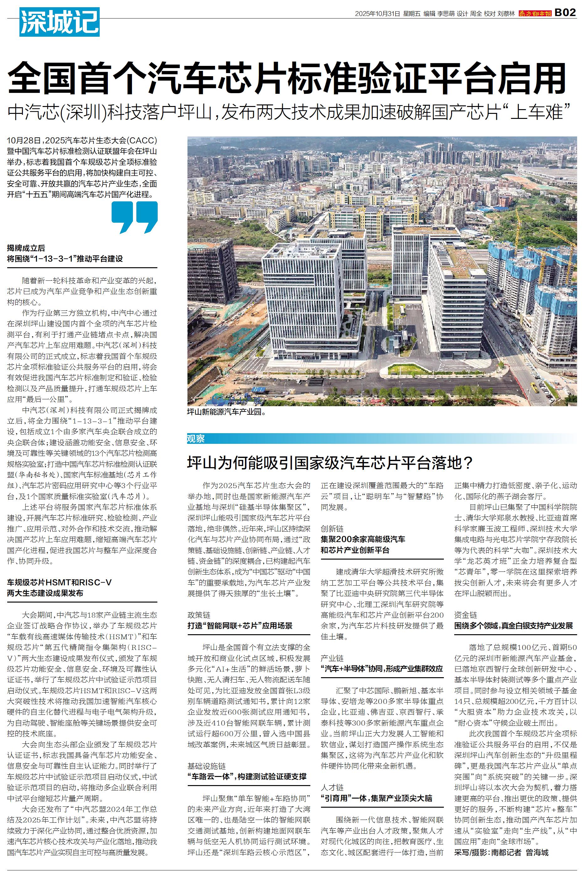 10月28日,2025汽车芯片生态大会(CACC)暨中国汽车芯片标准检测认证联盟年会在坪山举办,标志着我国首个车规级芯片全项标准验证公共服务平台的启用,将加快构建自主可控、安全可靠、开放共赢的汽车