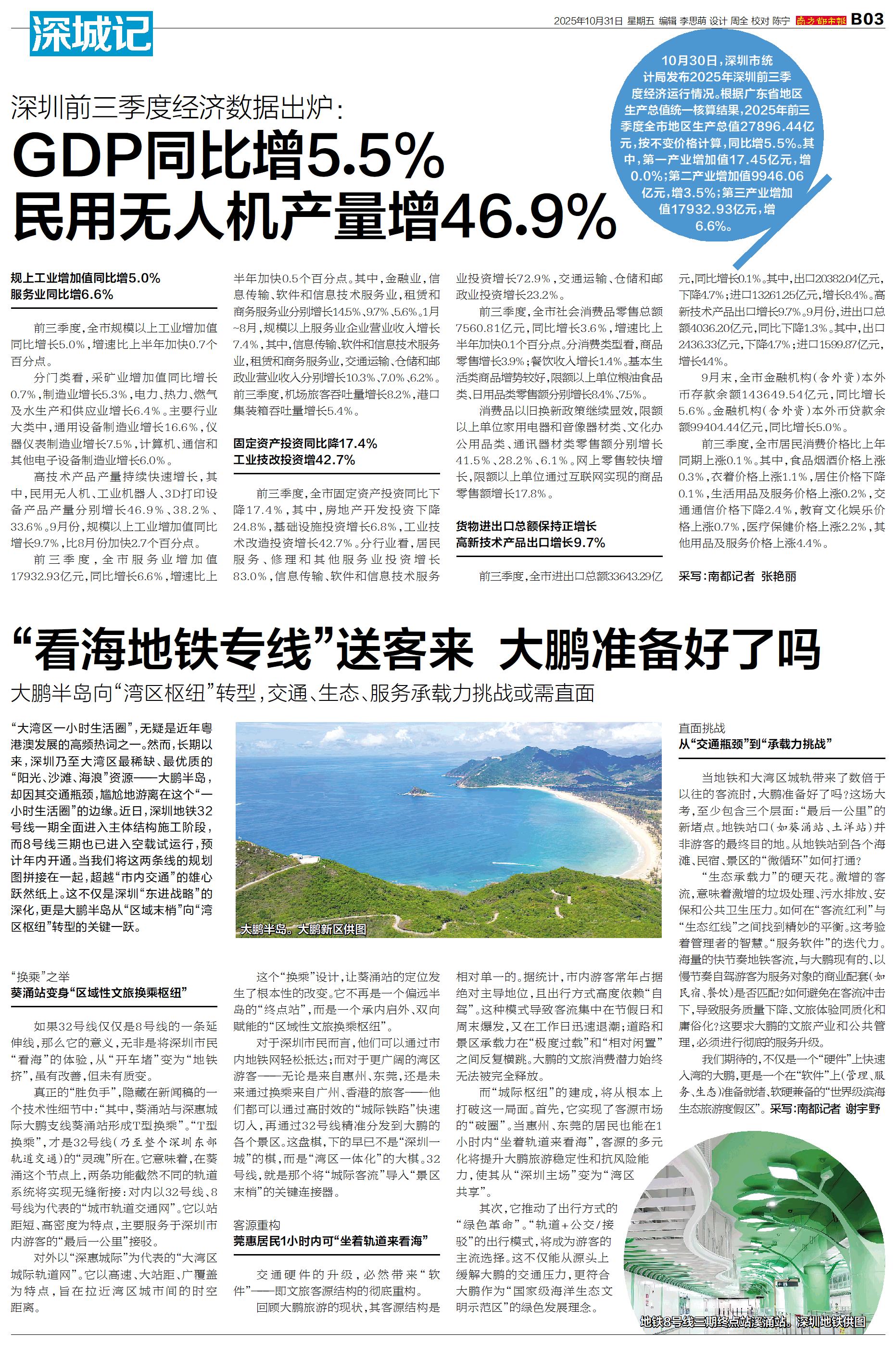 10月30日,深圳市统计局发布2025年深圳前三季度经济运行情况。根据广东省地区生产总值统一核算结果,2025年前三季度全市地区生产总值27896.44亿元,按不变价格计算,同比增5.5%。其中,