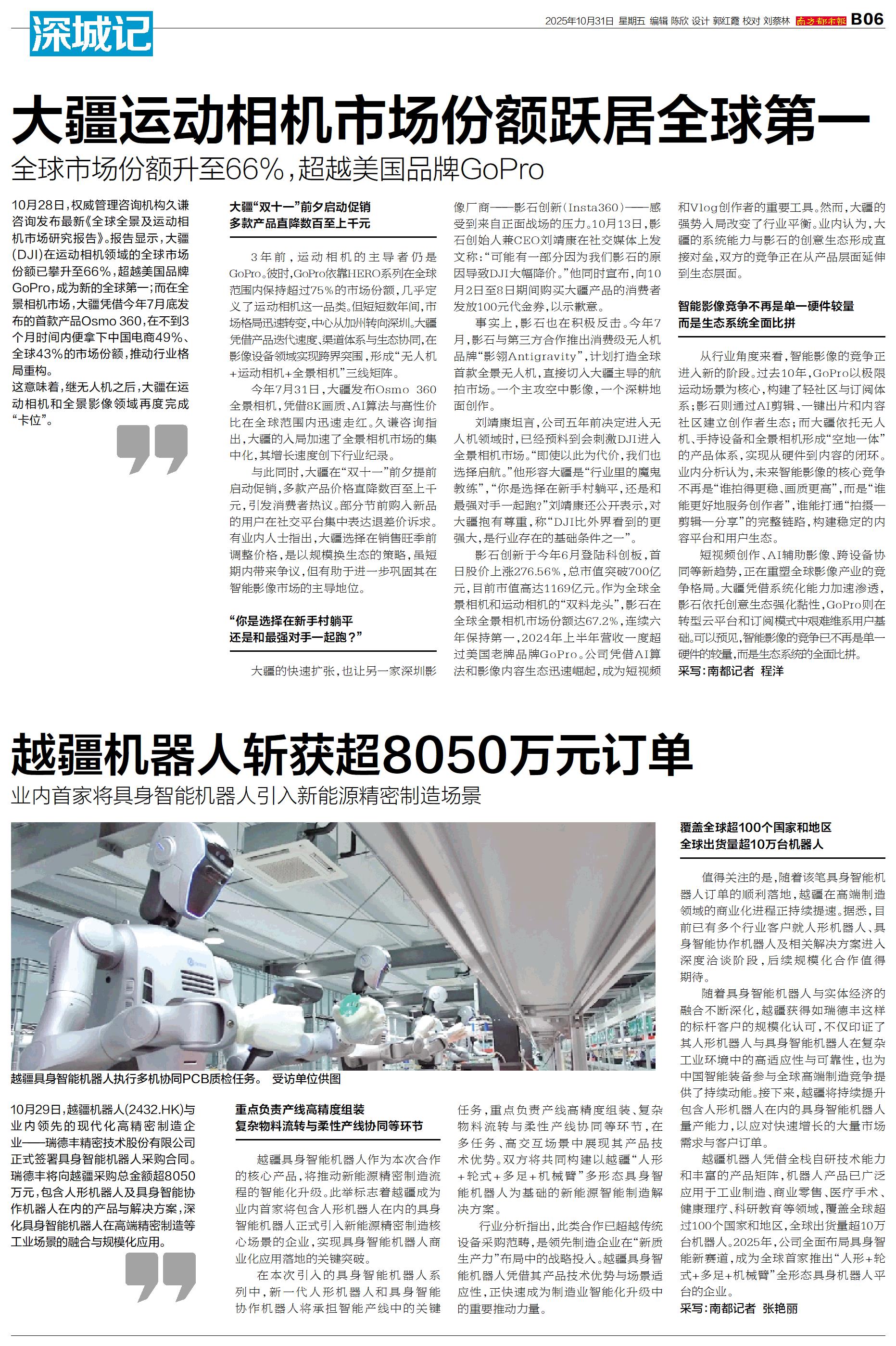 10月28日,权威管理咨询机构久谦咨询发布最新《全球全景及运动相机市场研究报告》。报告显示,大疆(DJI)在运动相机领域的全球市场份额已攀升至66%,超越美国品牌GoPro,成为新的全球第一;而在