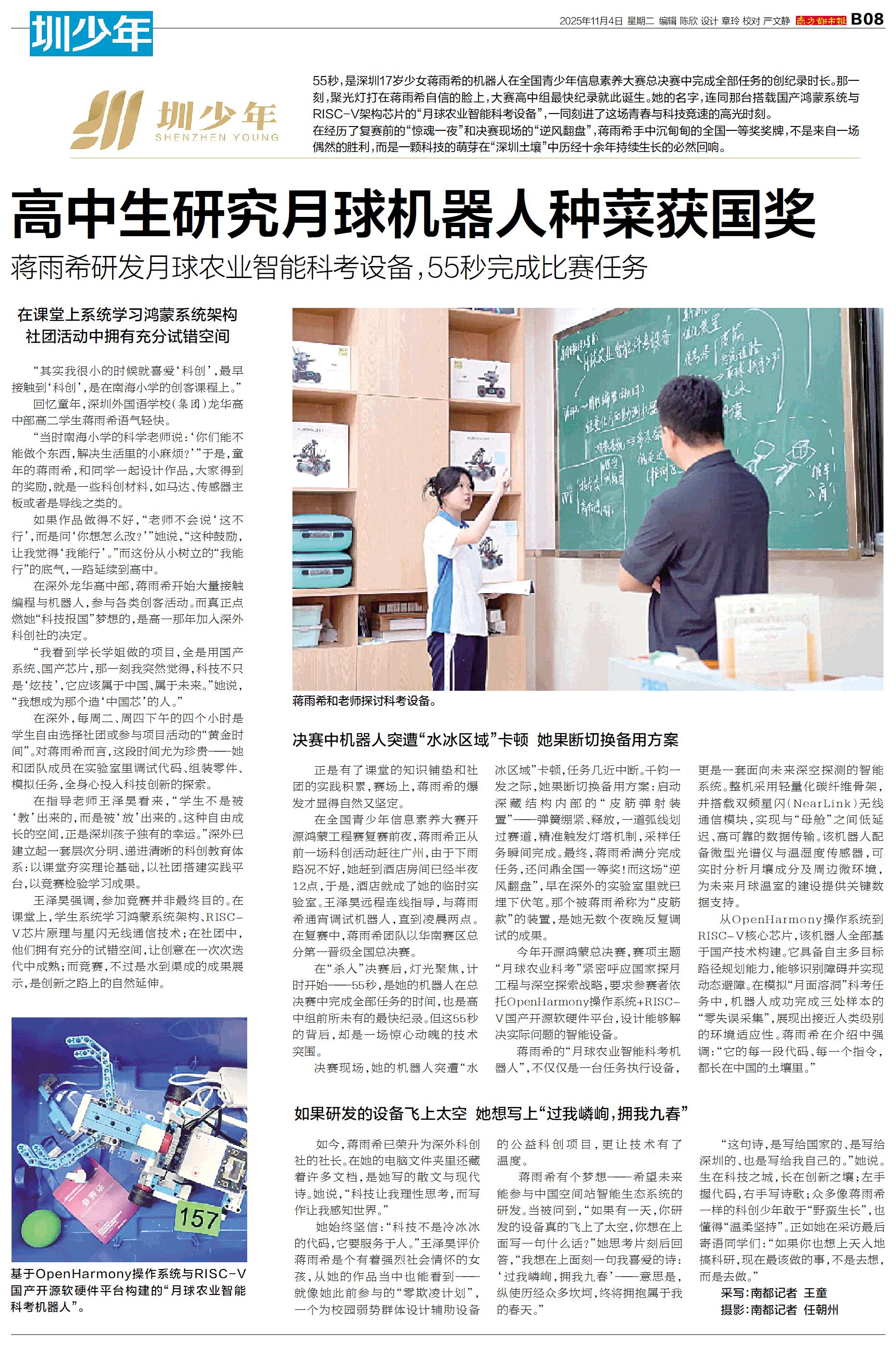 “这句诗,是写给国家的、是写给深圳的、也是写给我自己的。”她说。生在科技之城,长在创新之壤;左手握代码,右手写诗歌;众多像蒋雨希一样的科创少年敢于“野蛮生长”,也懂得“温柔坚持”。正如她在采访最后寄语同学们:“如果你也想上天入地搞科研,现在最该做的事,不是去想,而是去做。”