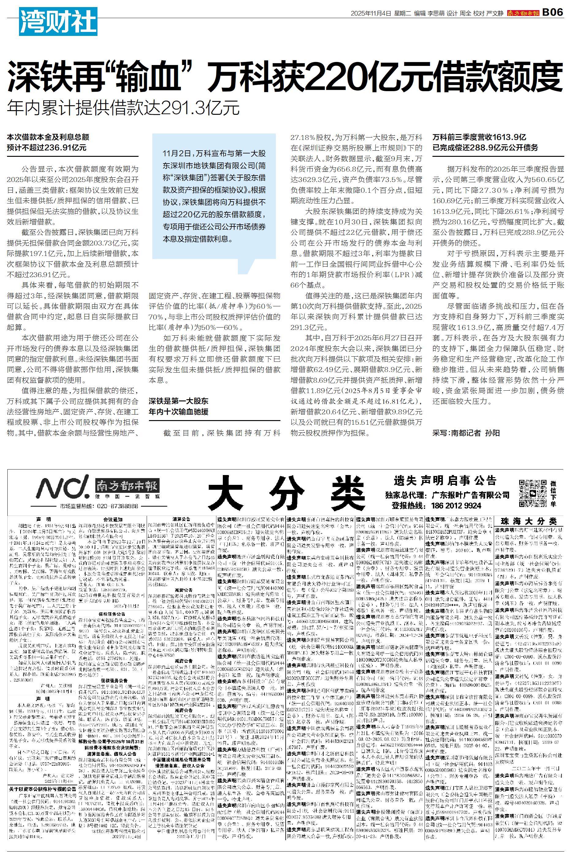 11月2日,万科宣布与第一大股东深圳市地铁集团有限公司(简称“深铁集团”)签署《关于股东借款及资产担保的框架协议》。根据协议,深铁集团将向万科提供不超过220亿元的股东借款额度,专项用于偿还公司公