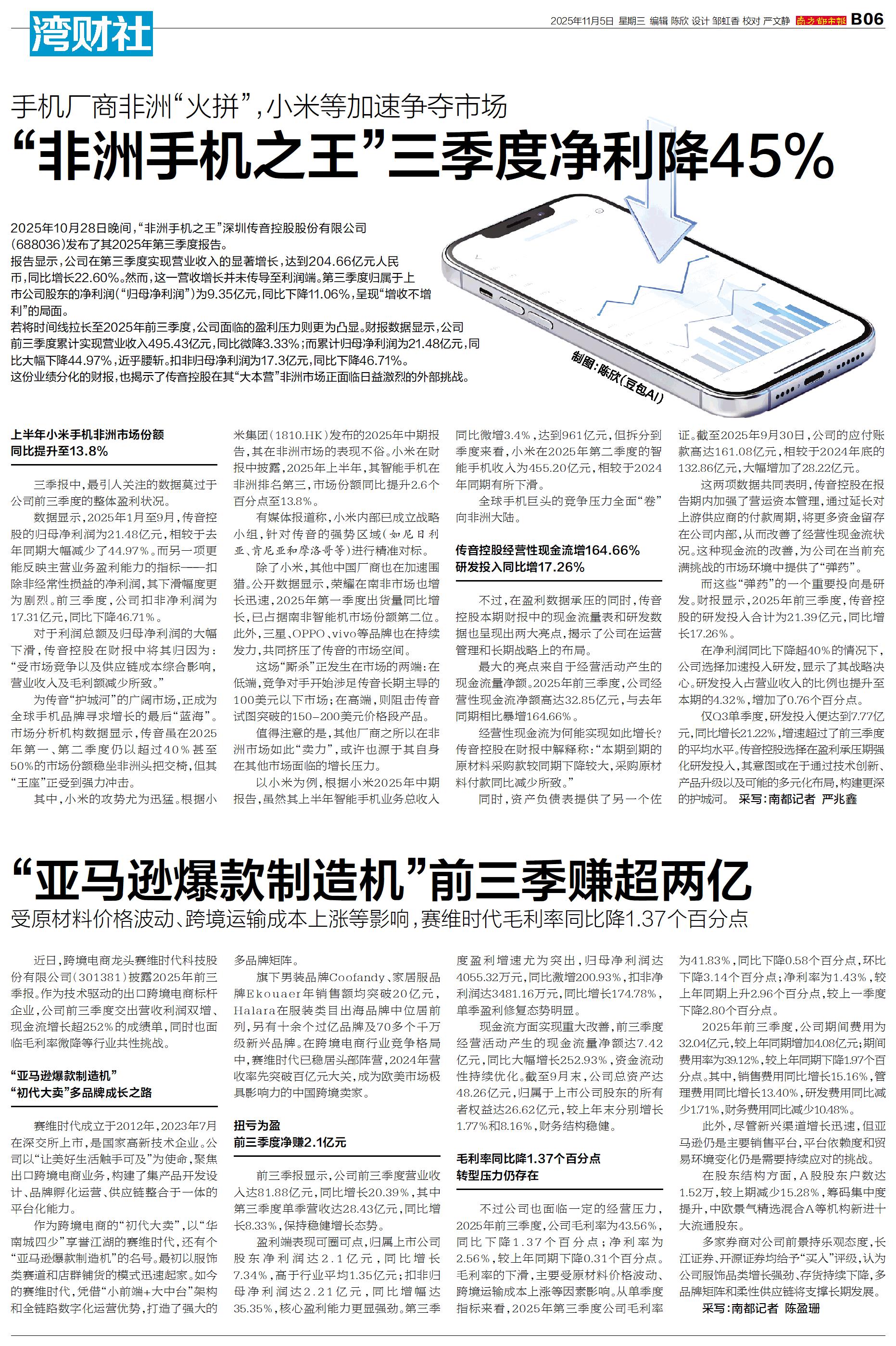 2025年10月28日晚间,“非洲手机之王”深圳传音控股股份有限公司(688036)发布了其2025年第三季度报告。 报告显示,公司在第三季度实现营业收入的显著增长,达到204.66亿元人民币,