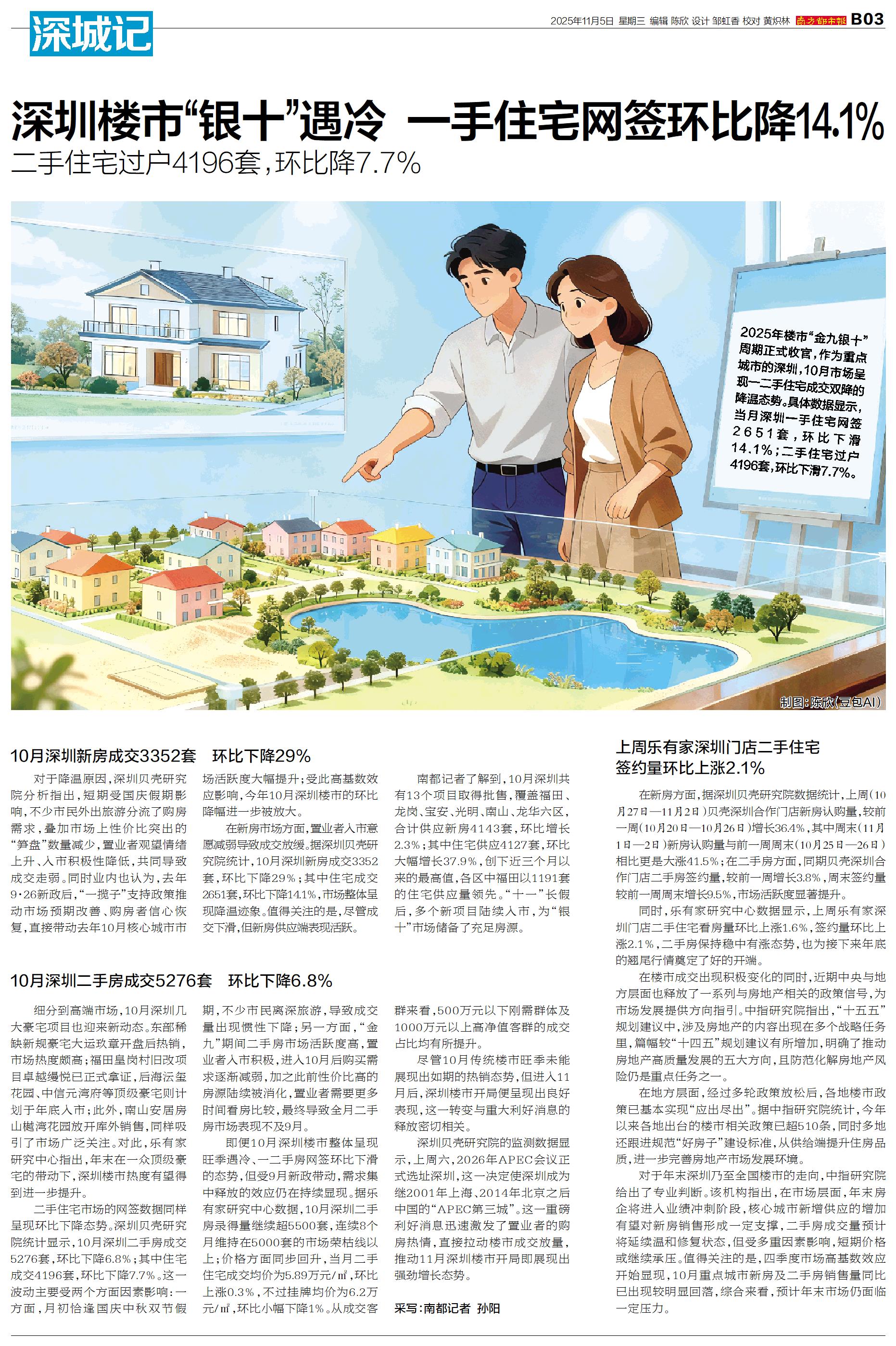 2025年楼市“金九银十”周期正式收官,作为重点城市的深圳,10月市场呈现一二手住宅成交双降的降温态势。具体数据显示,当月深圳一手住宅网签2651套,环比下滑14.1%;二手住宅过户4196套,环