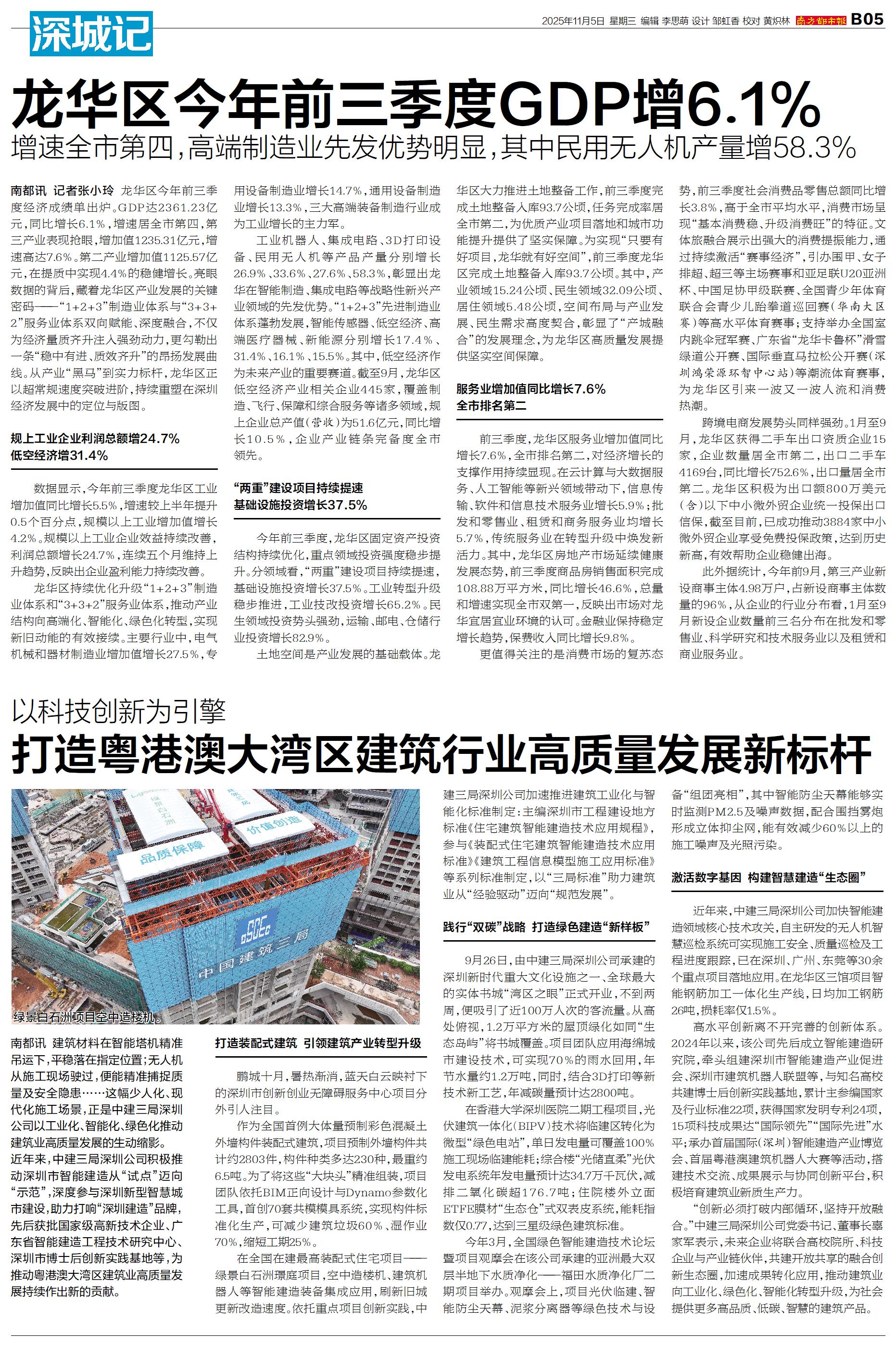 南都讯 建筑材料在智能塔机精准吊运下,平稳落在指定位置;无人机从施工现场驶过,便能精准捕捉质量及安全隐患……这幅少人化、现代化施工场景,正是中建三局深圳公司以工业化、智能化、绿色化推动建筑业高质量